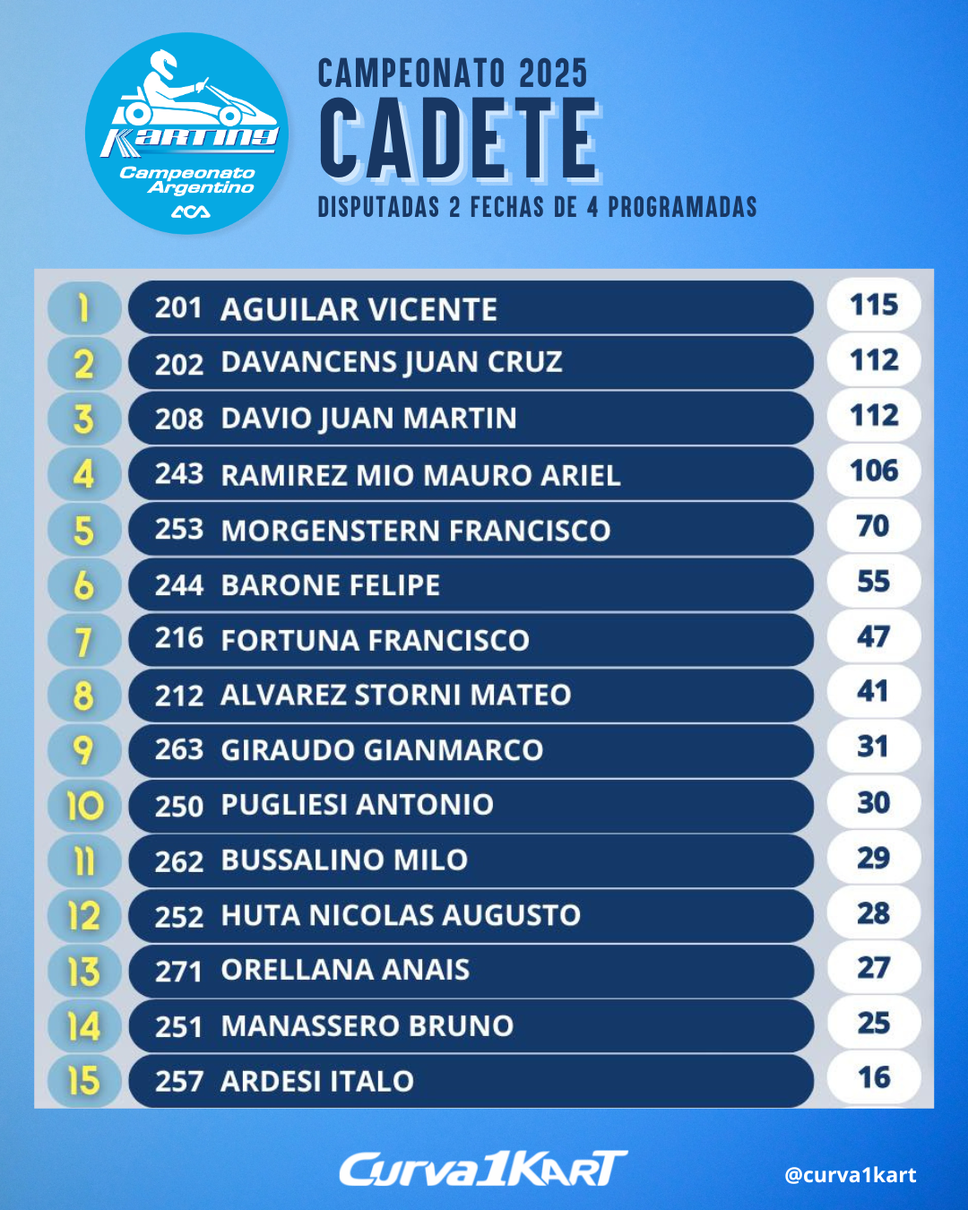 El neuquino VICENTE AGUILAR (Cronos Racing Team) es único puntero en Cadete con 115 unidades y lo siguen “empatados” a 3 puntos los bonaerenses JUAN CRUZ DAVANCENS y JUAN MARTÍN DAVIO.