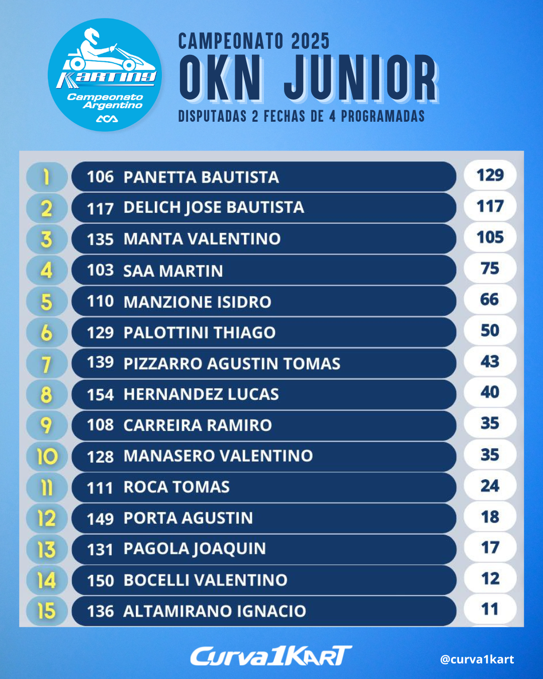 BAUTISTA PANETTA ha sumado 129 puntos en OKN Junior contra los 117 del cordobés BAUTISTA DELICH y 105 de VALENTINO MANTA.