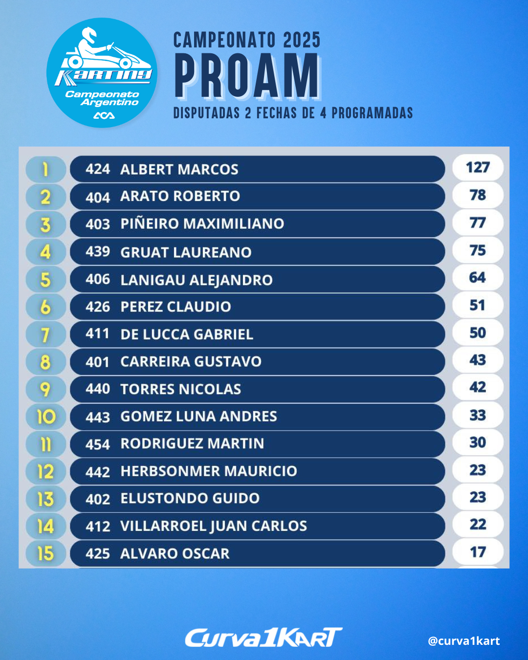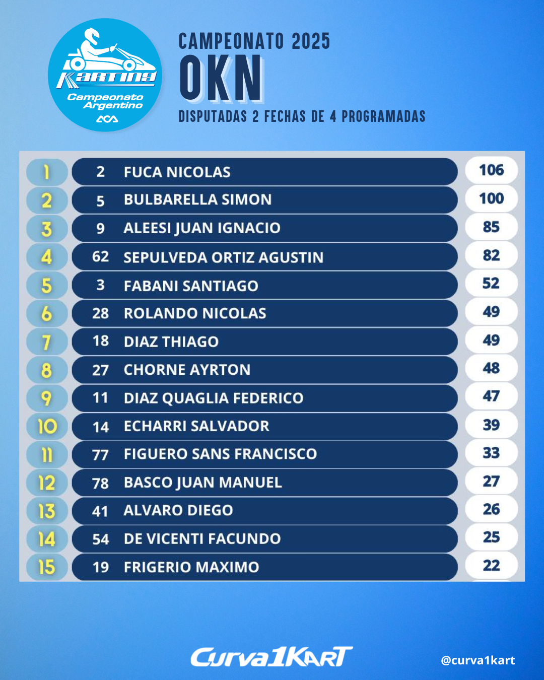 El santafesino de Zavalla NICOLÁS FUCA manda en la tabla OKN con 106 unidades, a la vez que SIMÓN BULBARELLA (Zaffaroni Kart) tiene 100 y lo sigue con 86 puntos JUANI ALESSI, cipoleño que viene de ganar en la última fecha realizada en mayo en San Martín, Mendoza.