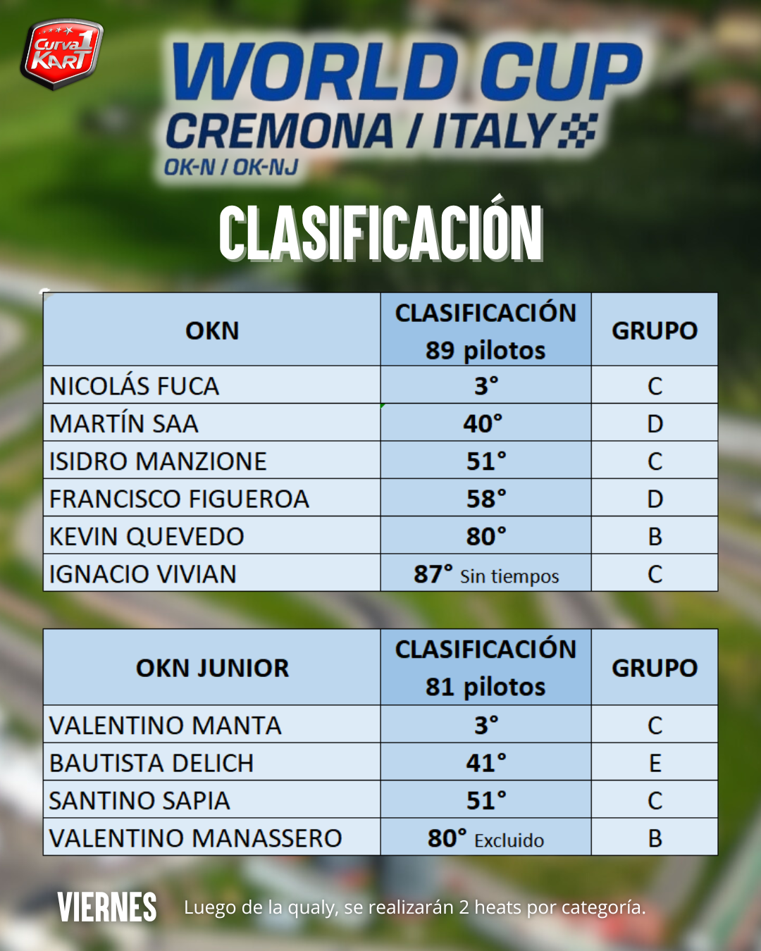 Se completó el primer día de competencias de la “Copa del Mundo de Karting FIA” en Cremona, Italia, donde este viernes se realizó la clasificación y 2 heats.