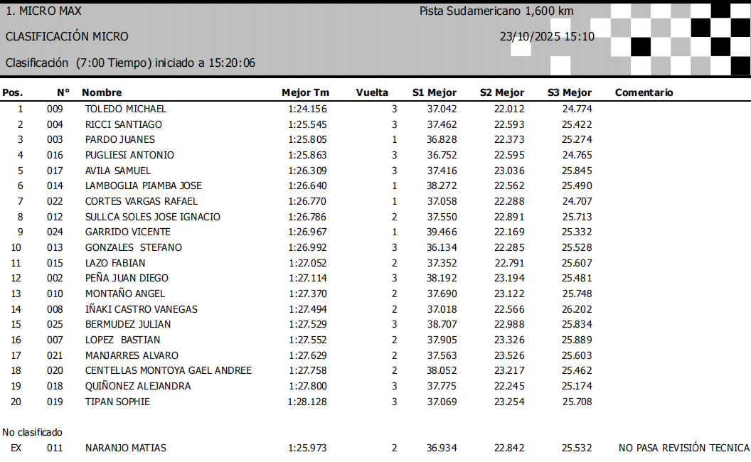 Luego de 4 prácticas cronometradas, solo 5 minutos antes de que la categoria Micro Max saliera a clasificar comenzó a llover. Pero a llover de una manera que los pilotos solo dieron 3 vueltas y la qualy se detuvo con bandera roja ya que todos estaba con neumáticos slick y hubo varios despistes.