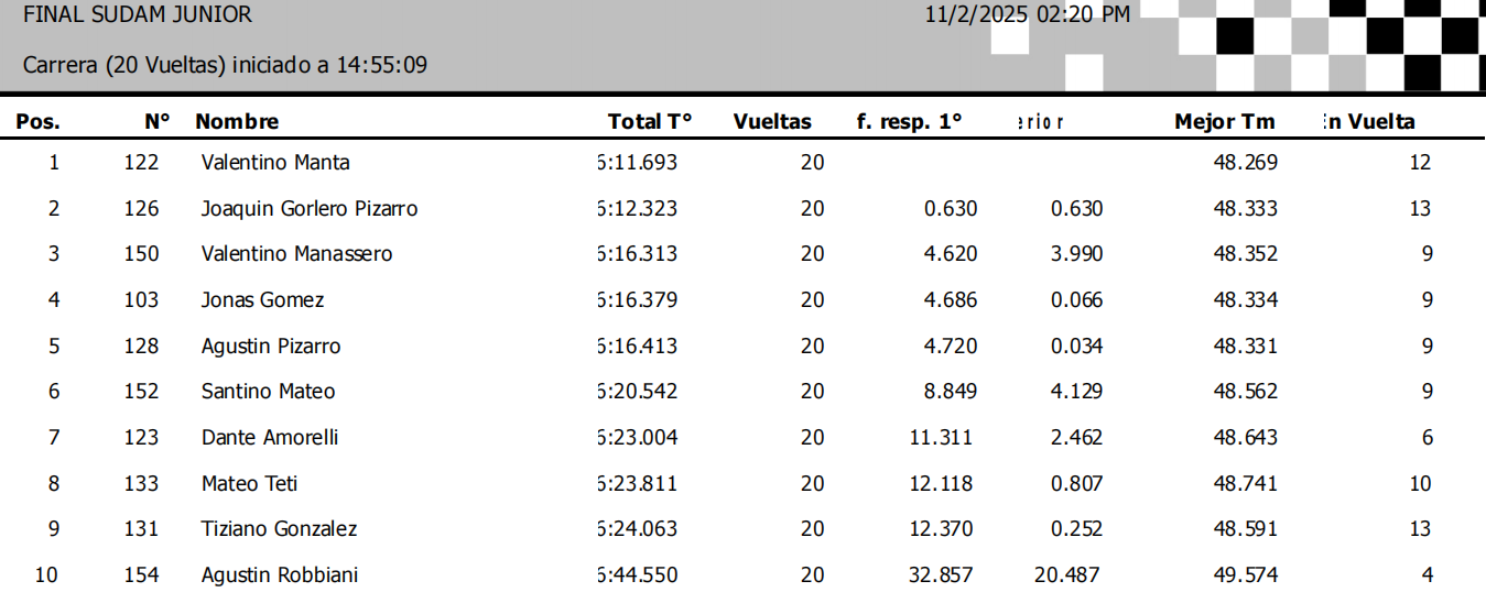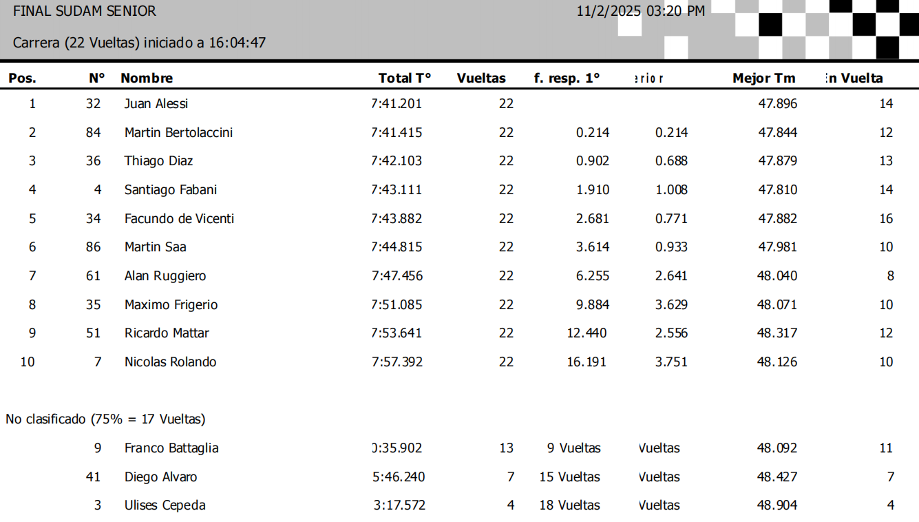 En el sprint Sudam Senior se vivieron momentos de nervios, luego de que un auto se accidentara fuertemente en el autódromo y una rueda, con un semieje y otras partes cayeran en el kartódromo en plena carrera. Fue una “desgracia con suerte” como dicta el dicho, ya que no impactó a ningún piloto, personal de pista ni fotógrafos que estábamos cerca de donde cayeron los elementos.