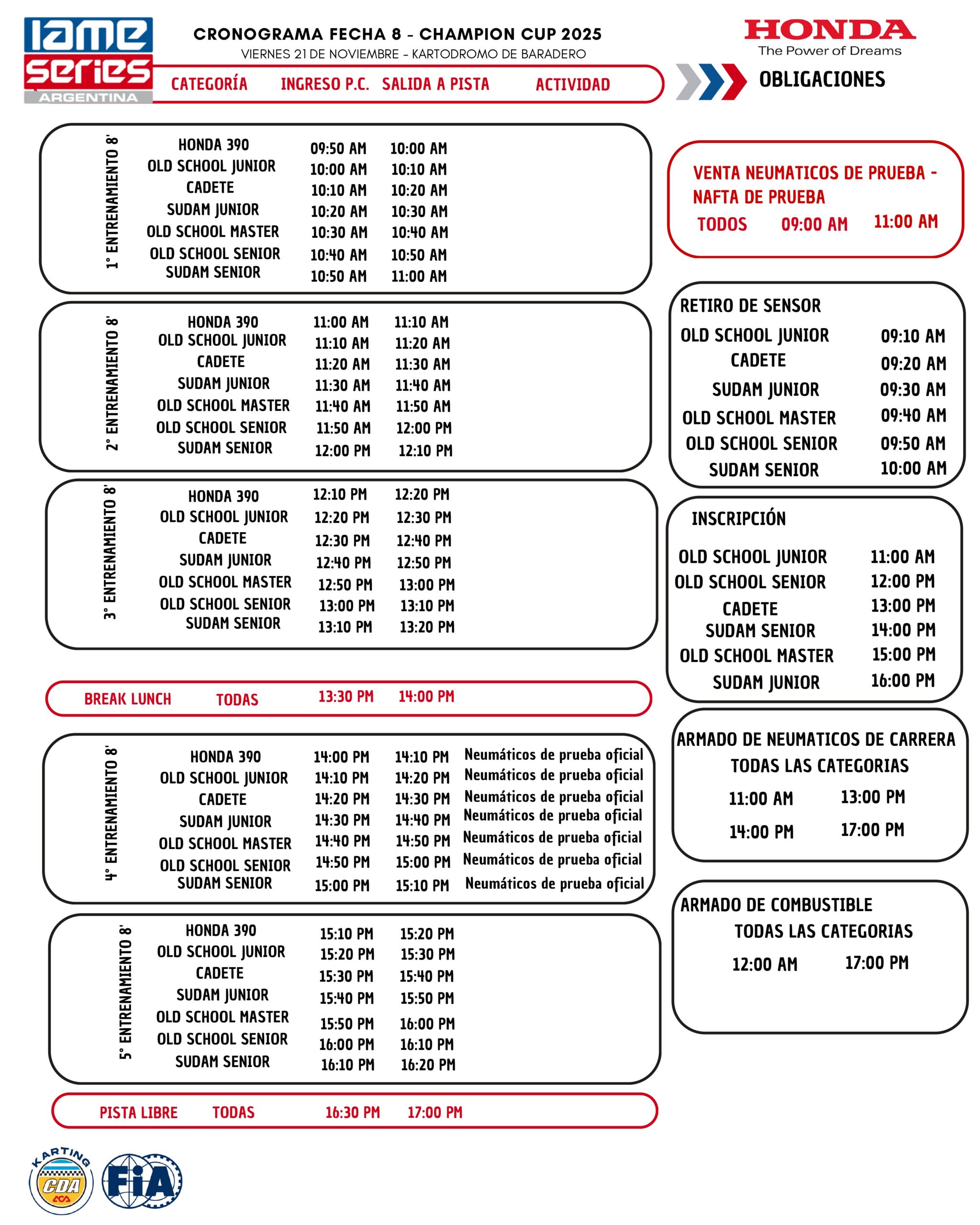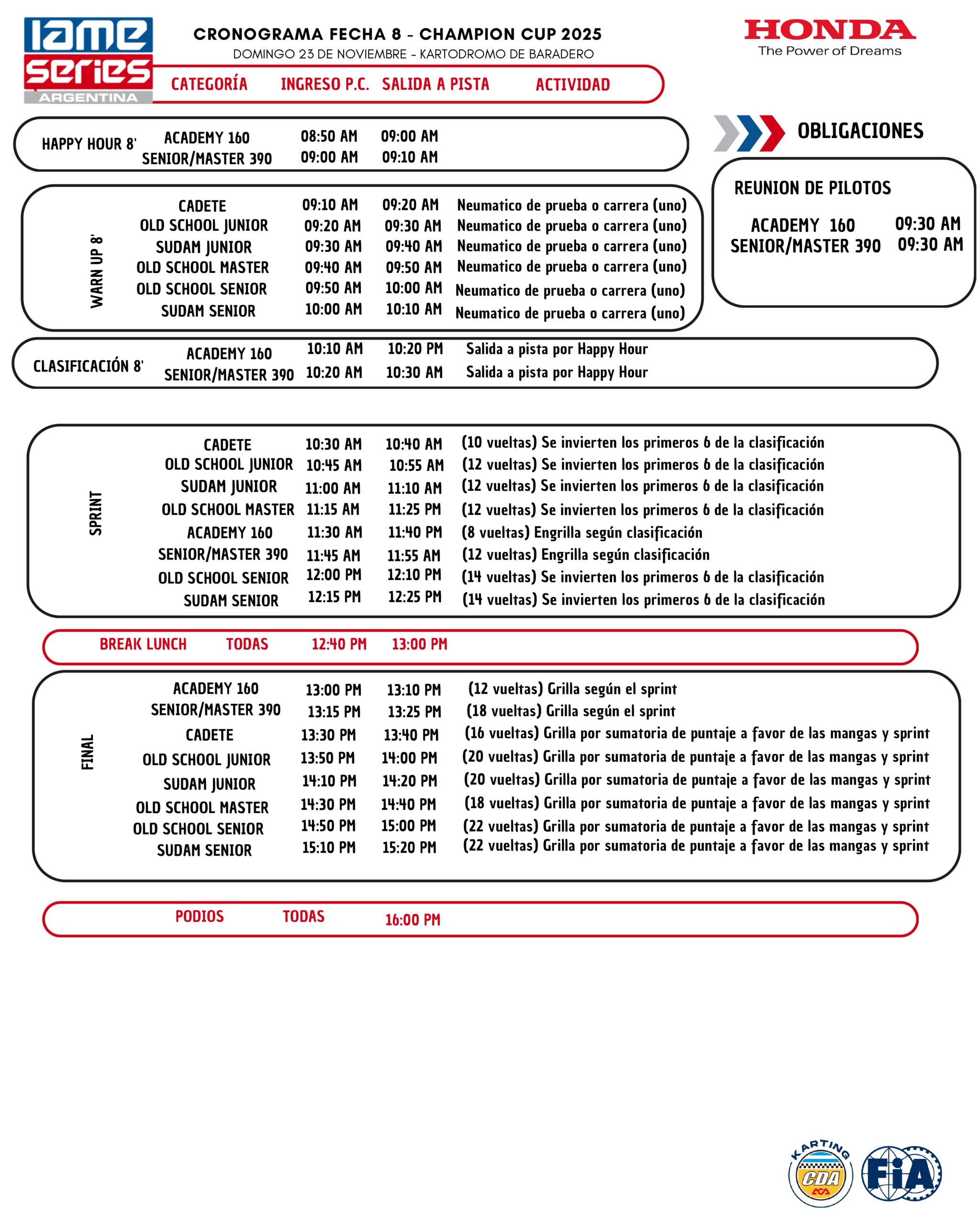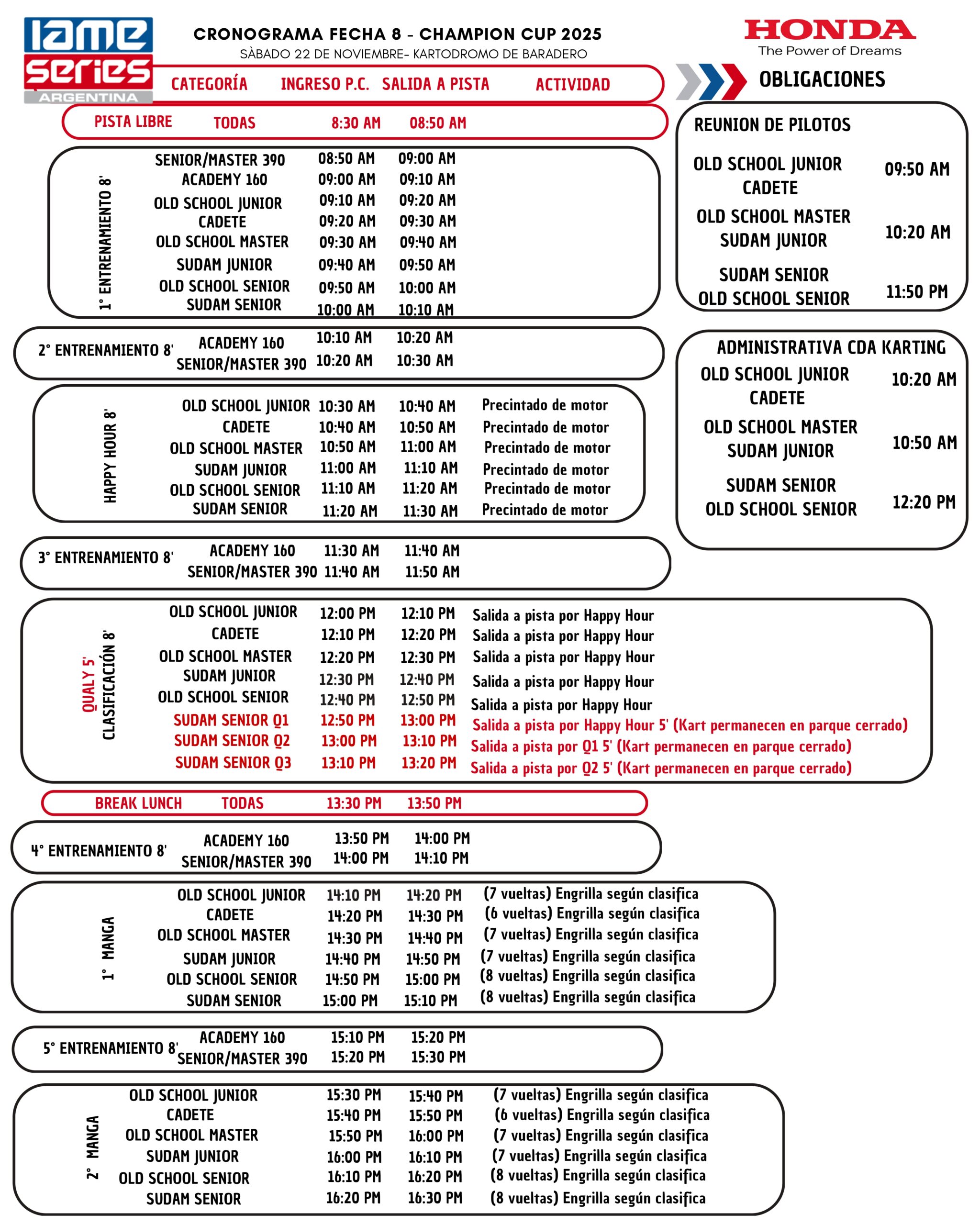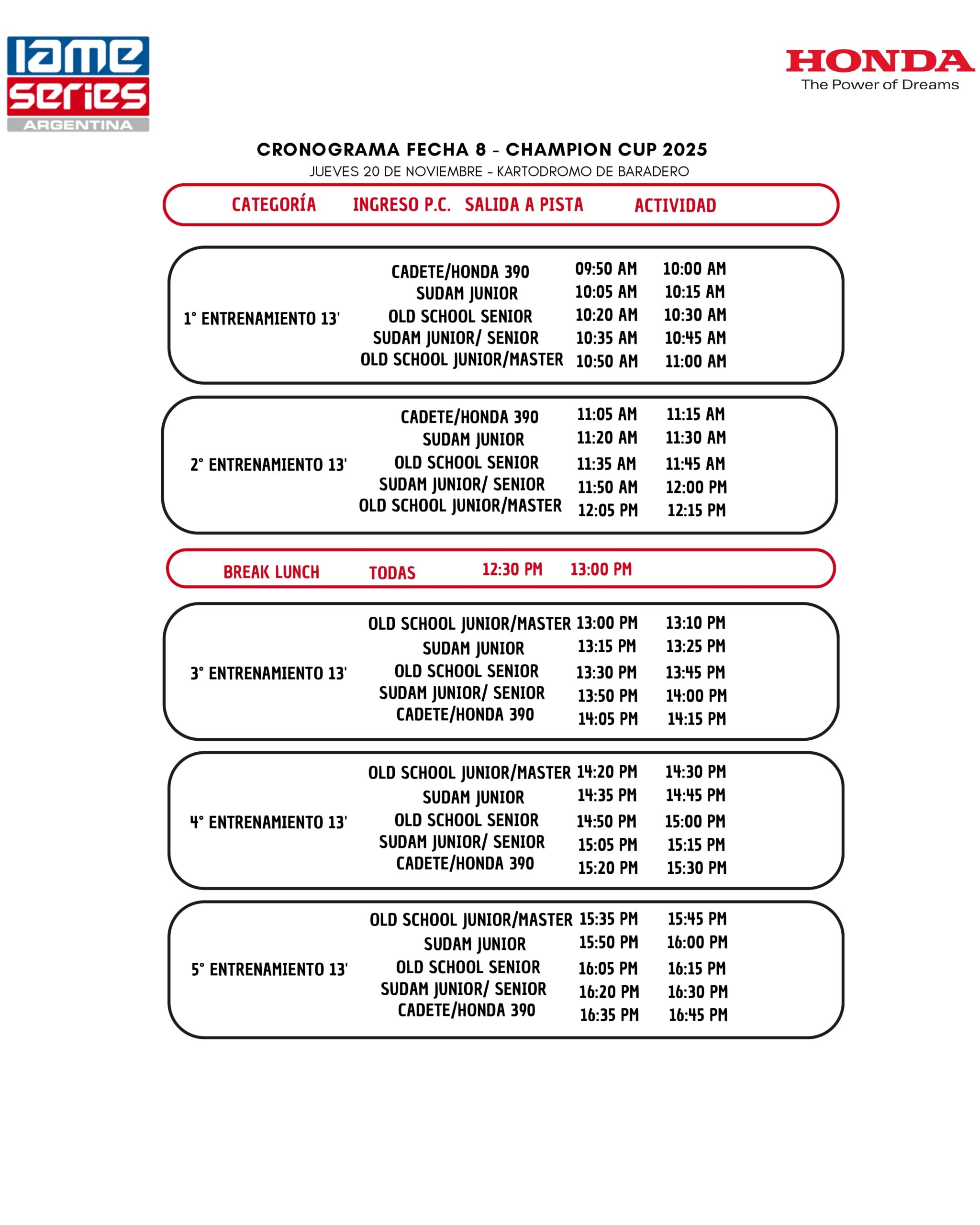 Para el SÁBADO hay programado warm up, tanda happy hour (que ordena la salida a clasificación), clasificación y 2 mangas. El día DOMINGO arranca con un warm up, las carreras sprint y luego las finales, que serán transmitadas por YouTube IAME Series Argentina.