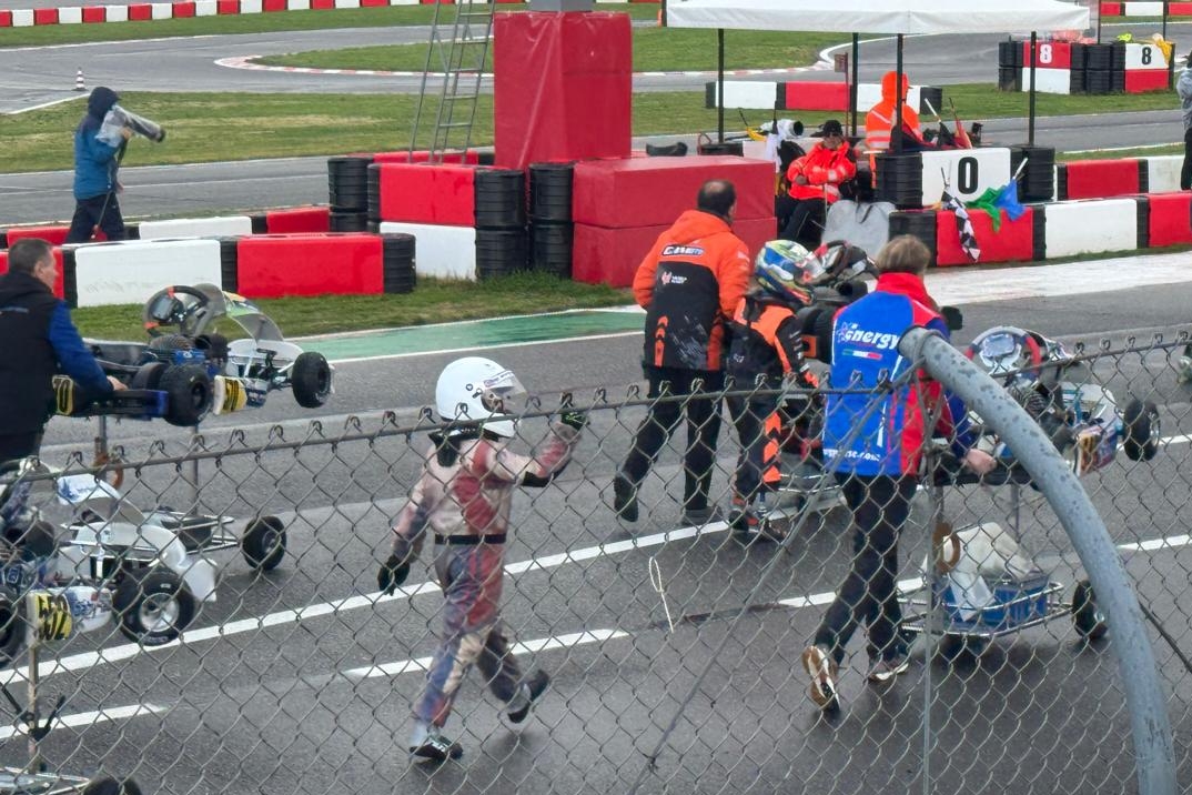 El sábado se definía todo y la lluvia fue determinante. El kartista de Maipú (Mendoza) se retrasó hasta el puesto 19° en la pre final, pero le alcanzó para ingresar a la carrera final, solo para los mejores 36 clasificados de los 51 inscriptos. “Largó 26° y se metió muy bien en el inicio, avanzando bastante, hasta que un choque múltiple en la primera vuelta dejó tirado a 4 karts y uno de ellos fue Felipe”.