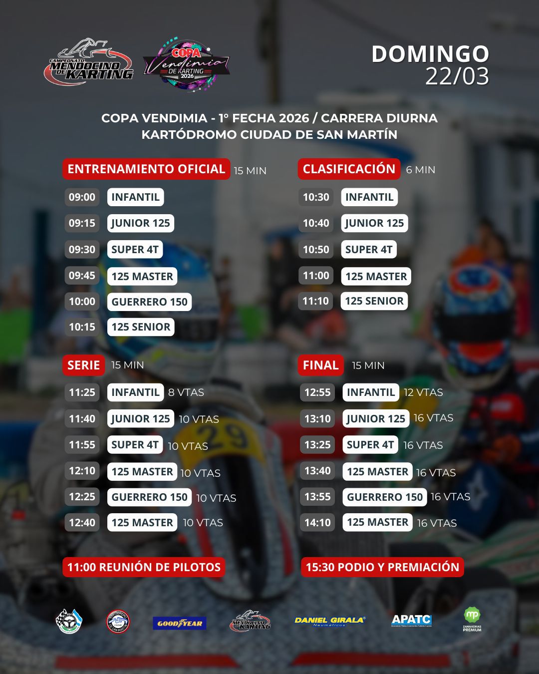 Para esta primera fecha, estará ausente la categoria Promocional IAME 60, ya que varios pilotos emigraron a la 125 Junior (que vuelve a armarse luego de 2 años) y otros en edad de “Promo” están compitiendo a nivel nacional. Pese a esto, se verá si durante el año puede salir a pista.