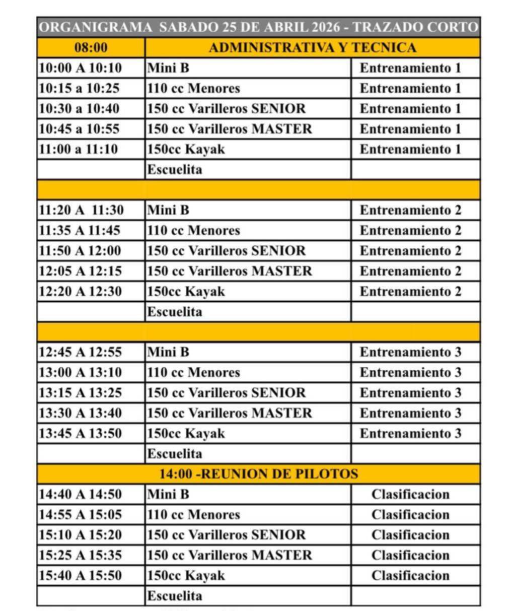 Finalmente, las categorías mini “B”, 110 cc Menores, 150 cc Varilleros Senior, 150 cc Varilleros Master y 150 cc Kayac cumplirán a partir de las 14:40 Hs con la primera clasificación del año, dictaron en el sitio Superdepor.