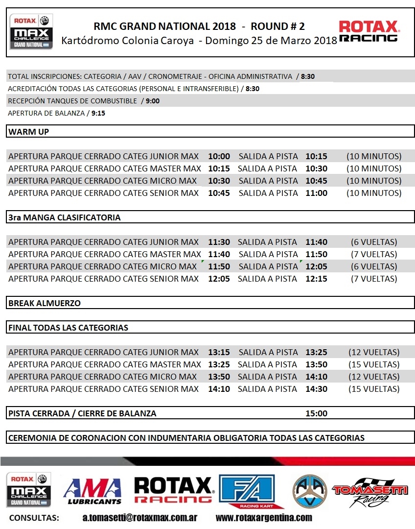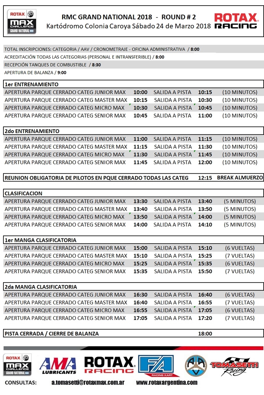 Se estarán presentando como es habitual las divisionales Micro Max, Junior Max, Senior Max y Master Max. Vale recordar los importantes premios que se otorgarán a los campeones de este certamen. El más importante es el de la divisional Senior Max, que recibirá un cupo al Mundial Rotax 2018, que se desarrollará del 26 de noviembre al 1 de diciembre en Brasil.
