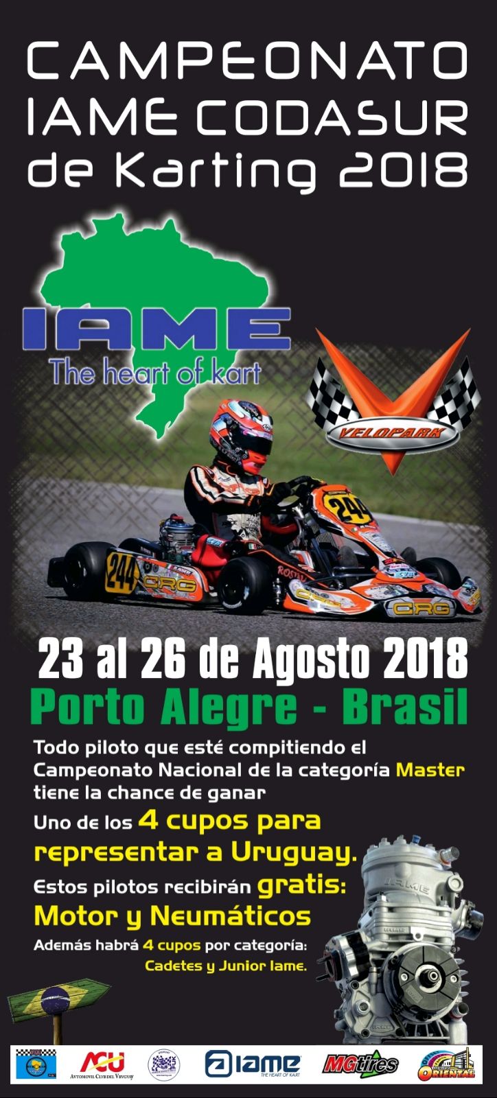 La Confederación de Automovilismo Sudamericano (Codasur), máxima autoridad del motor en la región, confirmó a sus países miembros la realización de la Primera Edición del Campeonato CODASUR IAME de Karting, certamen que se realizará en el kartódromo de Velopark, Porto Alegre, Brasil.
