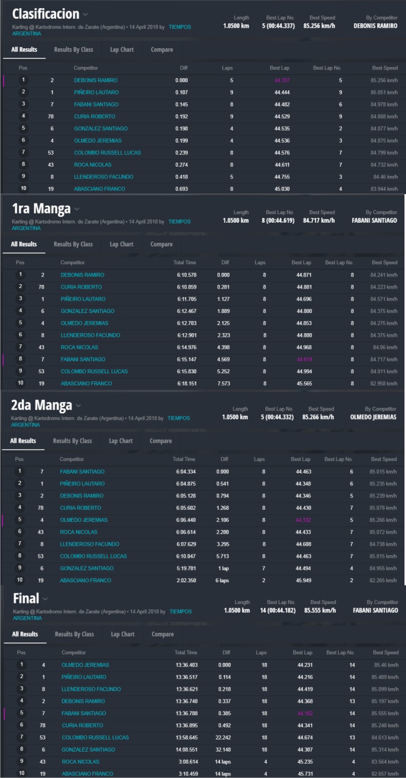 FINAL: La competencia tenía a DE BONIS y PIÑEIRO en primera fila, recordando viejos tiempos. Ásperos en el inicio dejaban prever una final infartante. PIÑEIRO manda en el inicio, pero rápidamente DE BONIS toma la punta. Nada estaba escrito, ya que, en la segunda vuelta, el que mandaba era el de Castelar GONZALEZ seguido de PIÑEIRO y FABANI, mientras DE BONIS involucrado en un toque pasa último. Una vuelta más adelante, el de Virrey del Pino PIÑEIRO comandaba el lote de hambrientos pilotos por la victoria. El de Haedo LLENDEROSO, con un karting mejorado en su rendimiento con respecto a las mangas, pasa como escolta y a mitad de competencia, marcaba hasta ese momento el récord de vuelta de la final. En el segundo tercio de competencia el póleman y ganador de la primera manga DE BONIS era sexto y se venía a la punta. Desde mitad del pelotón avanzaba OLMEDO, que hasta ahí se aseguraba un lugar en el podio. A mitad de competencia, ya se veía venir un sprint infartante, ya que se caía GONZALEZ, avanzaba FABANI, OLMEDO y LLEDEROSO, los que por momentos viajaban de a cuatro en las curvas del trazado Zarateño. A rio revuelto…, decía el retornado luego de varios años CURIA que viajaba quinto y se podía encontrar con una sorpresa sobre el final. Esto no le sucedió y con un CHIRSTIAN FERNANDEZ nuestro relator con la garganta prendida fuego, no podía decir quién era primero, segundo tercero o cuarto, ya que el Salteño OLMEDO casi por las últimas siete vueltas aguantaba a capa y espada en la punta al malón. A todo esto, DE BONIS seguía avanzando y cuando cayó la cuadriculada, quien se quedó con el récord de vuelta fue FABANI quinto, y los relojes marcaron victoria para OLMEDO. El escolta PIÑEIRO finalizó a 114 milésimas y el sexto quedó a 492 milésimas. Esta final fue por organigrama la última competencia, cerrando la fecha con ganas de seguir viendo más de estas competencias que pusieron a todos los presentes gritando sobre el alambrado.
