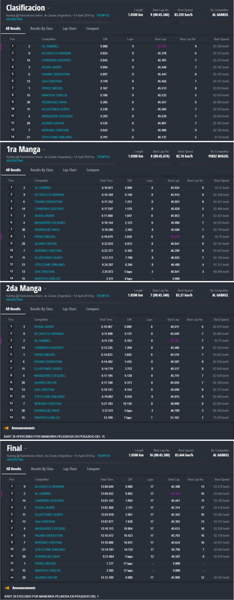 FINAL: Final en marcha con dos promesas en la primera fila, AL y DI CROCCO. Con el verde habilitando la carrera, todos pasan bien la primera curva, pero al llegar al “pico de pato” zafarrancho de combate y quedan fuera de competencia tri campeón PEREZ y MARTICH, ambos pilotos C.R.G. Adelante se acomoda el Quilmeño DI CROCCO con un AL, qué si bien le cuidaba la espalda, era candidato a la victoria. ROSSI no contaba con el auto que tenía en Bs. As., pero se mantuvo adelante. CARREIRA otro que siempre está en los primeros lugares, se mantenía en las posiciones de podio. Durante gran parte de la competencia, el de Del Viso CARREIRA se vio apurado por ELUSTONDO, que había cambiado motor para la manga y largó desde el puesto once. En las primeras vueltas las posiciones del podio eran siempre las mismas, con modificaciones en las diferencias entre pilotos, en las cuales ROSSI quedaba afuera del festejo. Pasado el meridiano de la competencia que tuvo una vuelta menos de velocidad pura, ahora sí, ROSSI logra el último escalón del podio, esto le sirve en función del campeonato, ya que quien había llegado líder PEREZ no pudo sumar. Al finalizar la competencia, la victoria se la llevó por primera vez en el Regional de Karting DI CROCCO, al cual lo saludaron todos los pilotos y preparadores rivales. Otra vez AL, se quedó con el récord de vuelta.