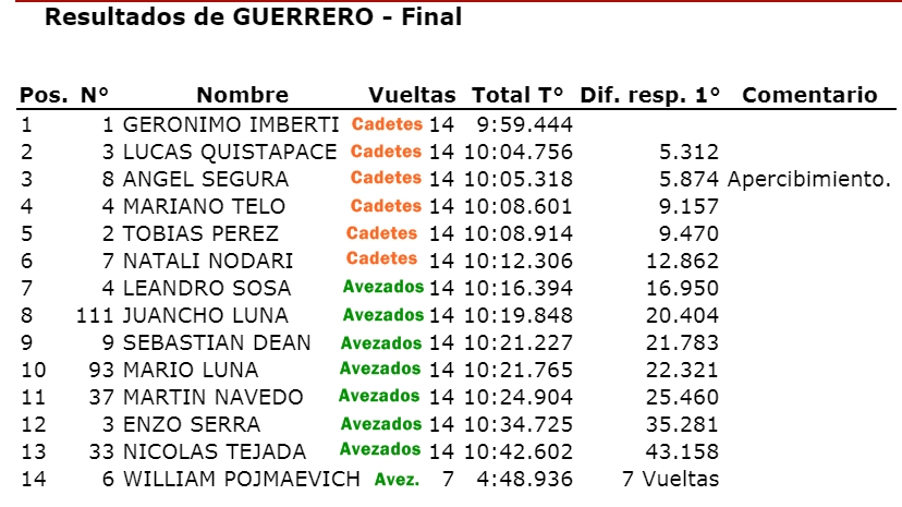 Los “guerreros” volvieron a competir en forma conjunta y dieron un espectáculo interesante. El actual campeón Gerónimo Imberti parece imbatible y volvió a ganar en la clase Cadetes. Detrás del piloto de Junín se ubicaron Quistapace (Godoy Cruz) y Angel Segura (San Rafael).