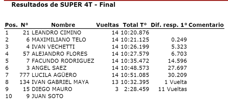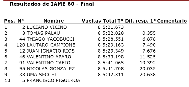 Palau y Thiago Yacobucci subieron al podio, este último defendiendo muy bien su posición ante los ataques de Lautaro Campione. Para destacar la excelente paridad y manejo de los demás pilotos que brindaron buenas carreras.