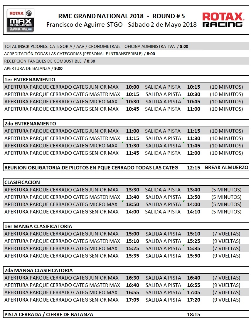 Se estarán presentando como es habitual las divisionales Micro Max, Junior Max, Senior Max y Master Max. Vale recordar el importante premio que se otorgará al campeón de la clase Senior Max, quien se hará acreedor a un cupo para participar de Mundial Rotax 2018, que se desarrollará del 26 de noviembre al 1 de diciembre de este año en Brasil.