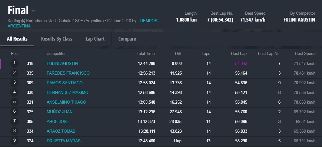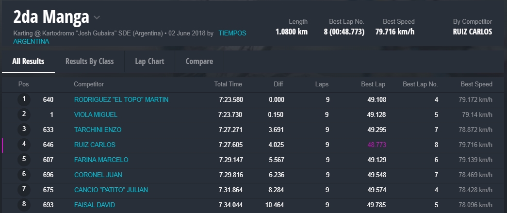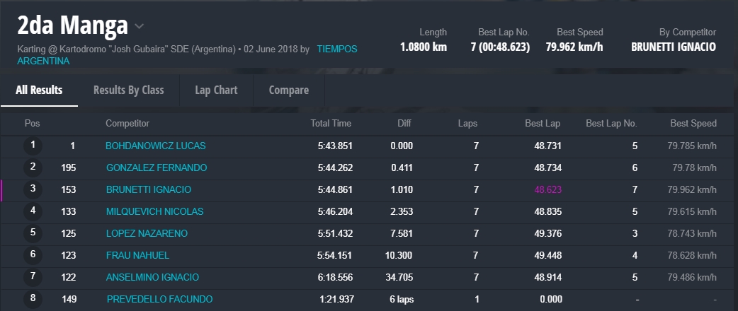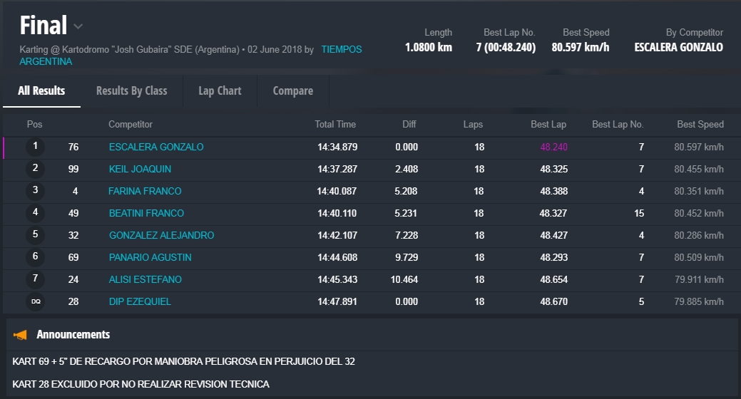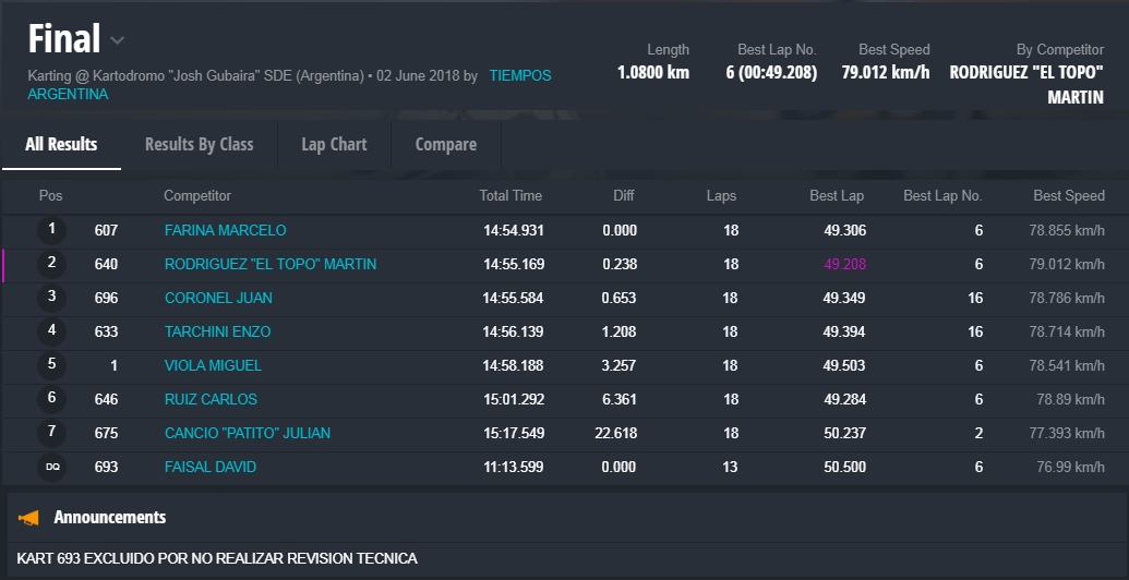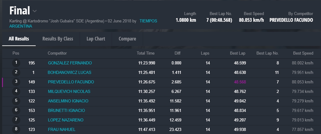 Y en la final, la gran sorpresa fue la que dio el local, Marcelo Farina, que se alzo con el cetro, luego de tremendas batallas en donde, Juan Coronel, otro local, punteo durante gran parte del desarrollo de la misma, todos en una franca lucha en donde estuvieron involucrados, el monarca 2017 de la divisional, Miguel Viola, Rodriguez , otro santiagueño , Enzo Tarchini, en fin grandes luchas con gran predominio de los pilotos locales , pero ninguno desentono en esta fiesta que nos dieron de sorpazos en el escenario de Santiago.