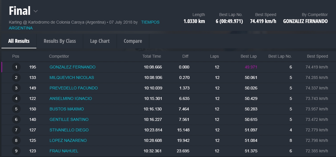 La divisional dejo sorpresas porque el actual puntero del campeonato, Gonzalo Escalera, venia en un fin de semana para llevarse todo, ganando las tres mangas clasificatorias y asi en la final, todo hacia preveer que nada cambiaria, imponia un ritmo demoledor pero..aparecio el factor sorpresa, que nada tenia que ver con el impecable manejo que venia haciendo Gonzalo que habia sacado una ventaja de mas de cinco segundos a quienes venian detras, esta vez fallaron los frenos. Y notese que narre, quienes venian detras. Si porque precisamente detras venian, en esta verdadera batalla que duraron estas 15 vueltas al trazado Caroyense, Joaquin Keil, Franco Farina y Estefano Alisi, quienes se trabaron en una lucha que no tuvo respiros, cambiaban el segundo lugar constantemente, el Correntino Keil y el Santiagueño Farina y prendido en el trencito el Cordobes , Alisi. La contienda tomo su punto maximo cuando el Tucumano Escalera se va un poco afuera en momentos que salia de la recta principal y comenzaba a hacer el dibujo de la segunda curva y faltando solo 2 vueltas todo cambio y era logico,al estar sin los frenos, no habia forma de poder llevarlo a fondo al Kart, doblar e intentar que no se salga de la pista era, casi imposible llevarlo y asi vio venir a Farina a Keil y Alisi, estos, que venian peleando por este segundo lugar,en una ajustadisima maniora, en una curva hacia la izquierda, Farina se tira por afuera para intentar sobrepasar a Escalera, pero Keil avisoro la maniobra y se tira por dentro capturando la punta detras tambien se colaba Alisi que tomaba la segunda ´posicion , culminando Escalera tercero y Farina caia al cuarto lugar.