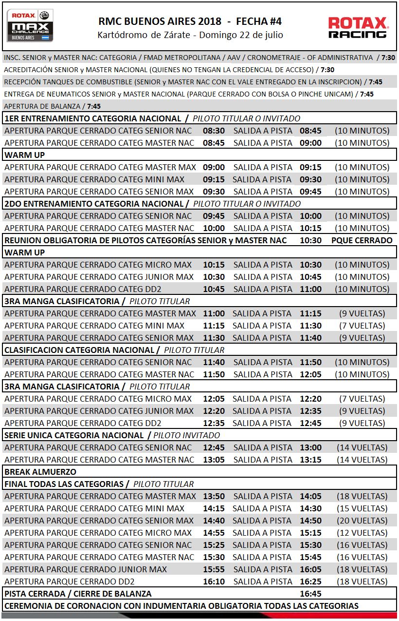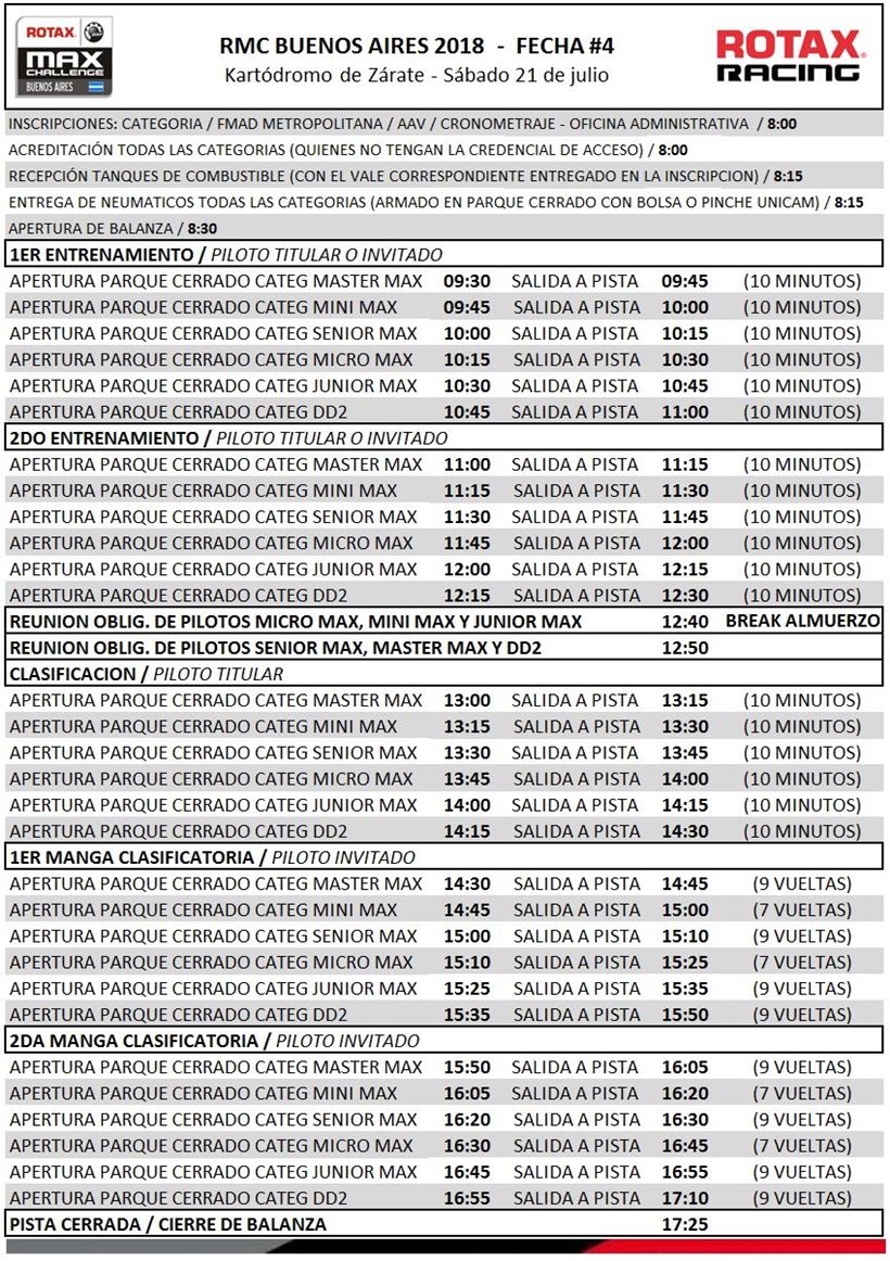 El cronograma de competencias será similar a los anteriores, salvo con la Clasificación, donde se destinarán 10 minutos de duración, tal como se usa en Mundial Rotax.