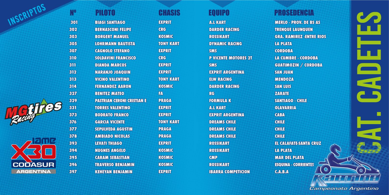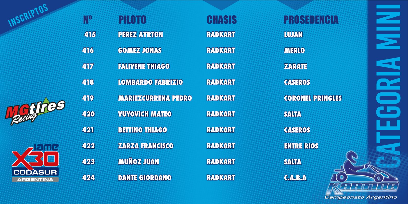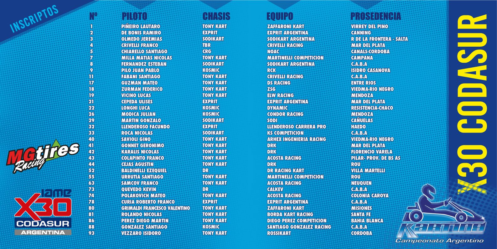 Las planillas indican 116 inscriptos de Argentina, pero también con visitas de Uruguay y Chile. La categorías más numerosa es la X30 CODASUR (34 pilotos), seguido por Proam Iame (26), X30 CODASUR Junior (24), Cadetes (22) y Mini (10). A estos se le deben sumar 10 pilotos de la Copa Modena con su fecha Open que serán parte del evento.