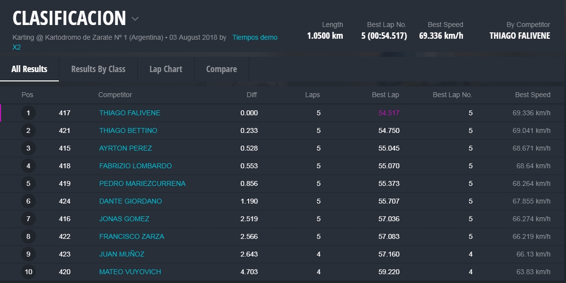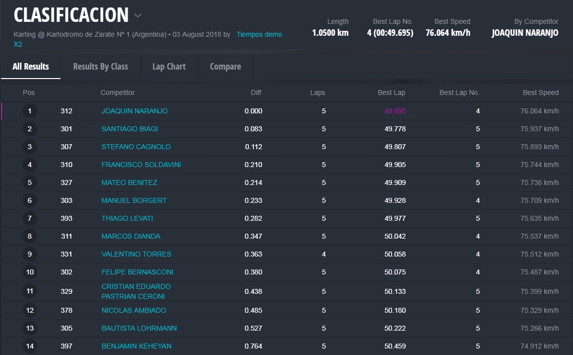La clasificación fue muy peleada y en la penúltima vuelta se quedó con el mejor registro Joaquín Naranjo, piloto de San Juan. Naranjo aventajó a Santiago Biagi por solamente 83 milésimas en una prueba que tuvo 17 pilotos dentro del segundo clasificatorio.