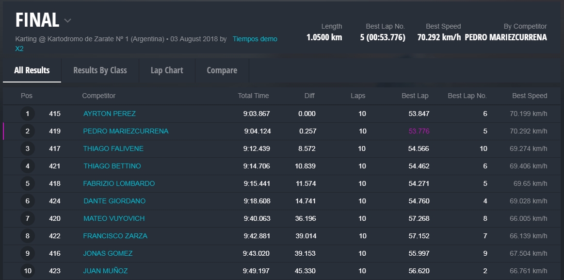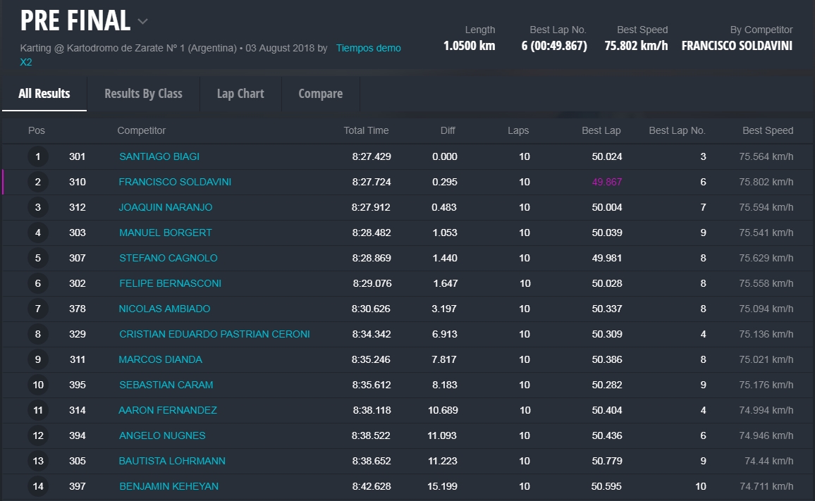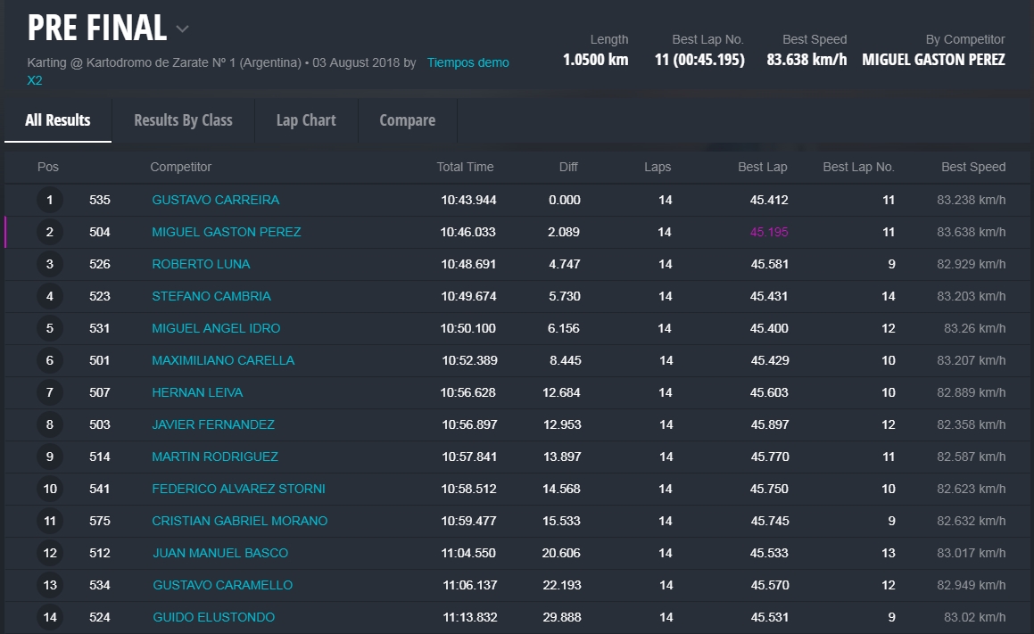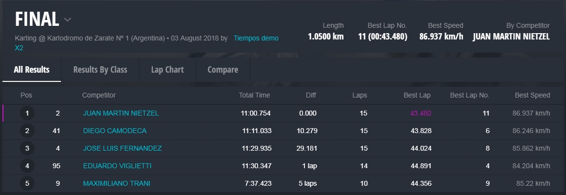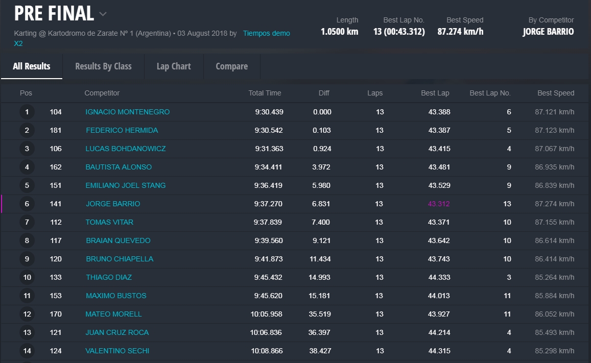 Faltando aproximadamente tres vueltas Barrio llegó a la punta y todo parecía que iba a ser el ganador, pero en el último giro extrañamente Barrio se perdió algo de velocidad, Hermida y Alonso aprovecharon y lo superaron en el ingreso a la recta que lleva a la curva de la tranquera. Alonso se puso adelante tapando todos los huecos que buscaba Hermida, que no se dio por vencido y en la última curva igualó la posición de Alonso para ganar la competencia con una diferencia de solamente 38 milésimas. Carrerón!