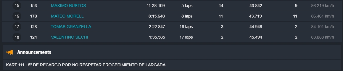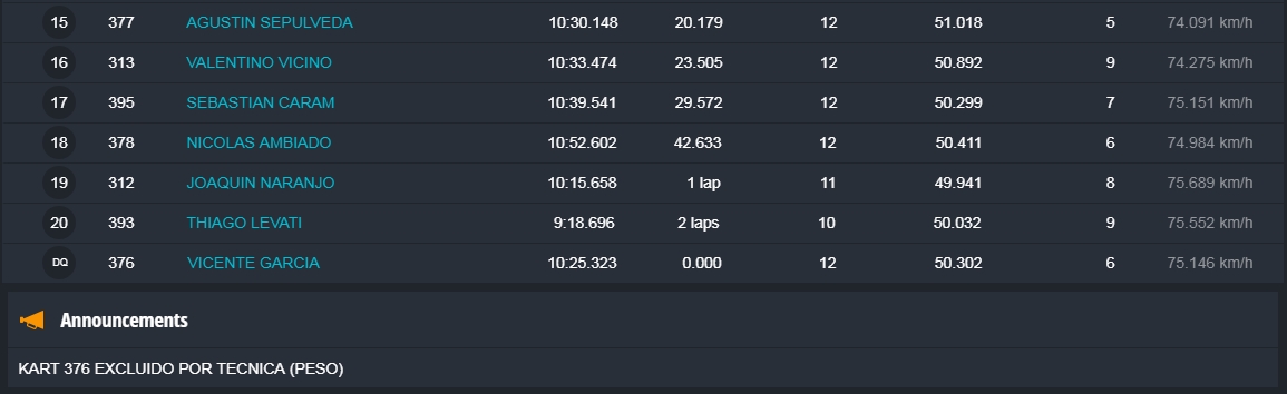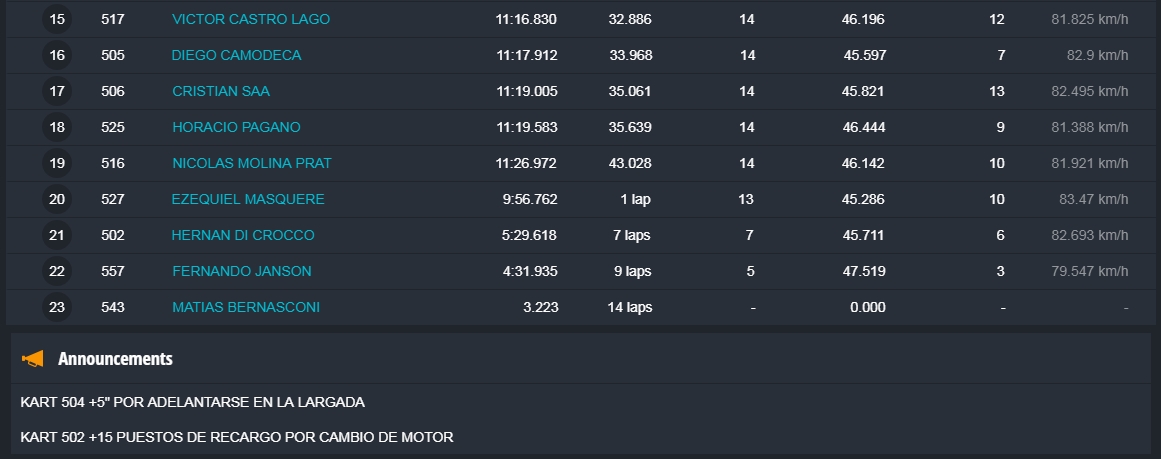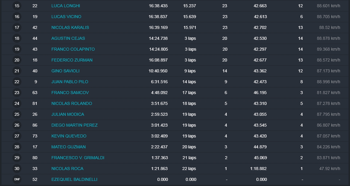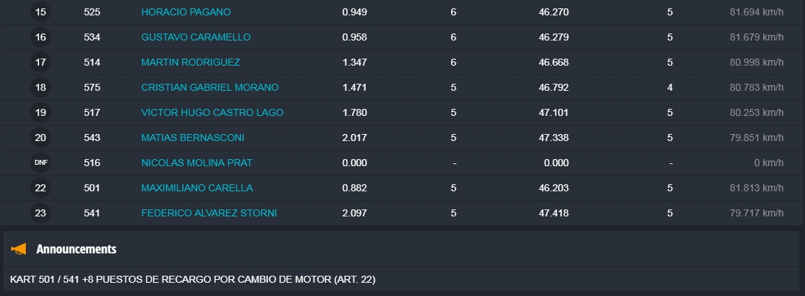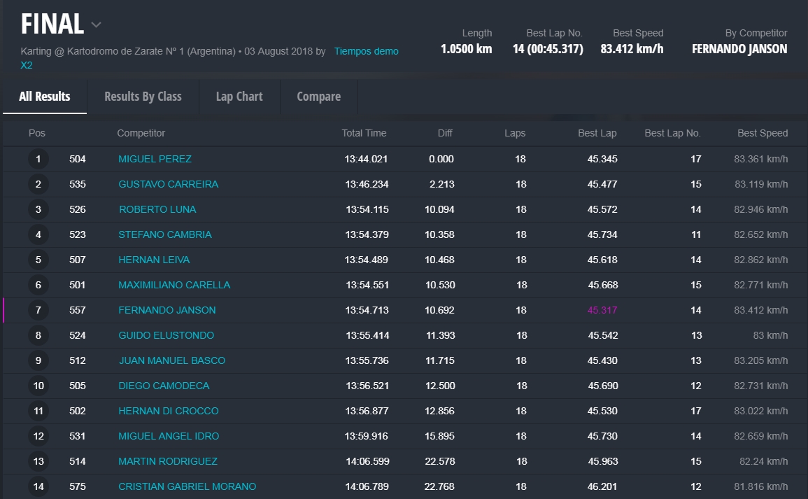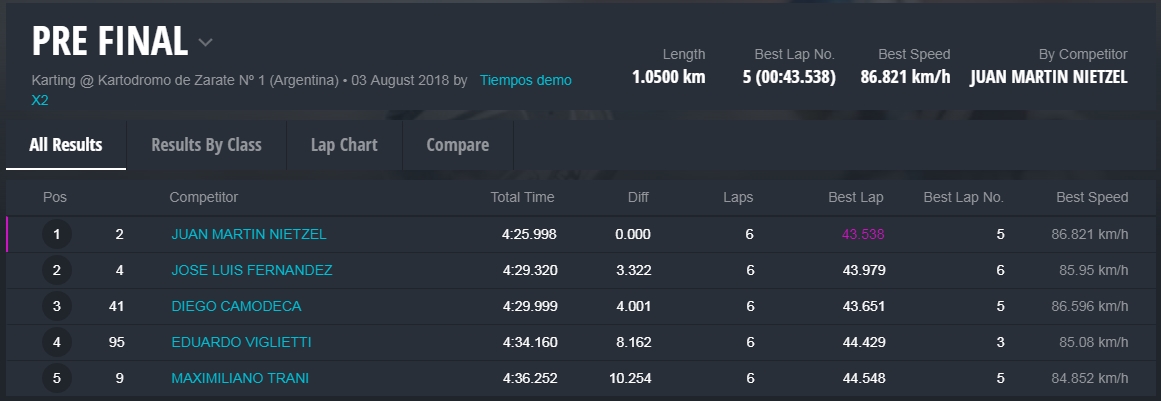 Faltando aproximadamente tres vueltas Barrio llegó a la punta y todo parecía que iba a ser el ganador, pero en el último giro extrañamente Barrio se perdió algo de velocidad, Hermida y Alonso aprovecharon y lo superaron en el ingreso a la recta que lleva a la curva de la tranquera. Alonso se puso adelante tapando todos los huecos que buscaba Hermida, que no se dio por vencido y en la última curva igualó la posición de Alonso para ganar la competencia con una diferencia de solamente 38 milésimas. Carrerón!