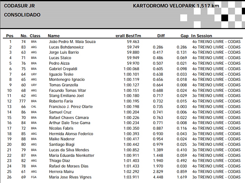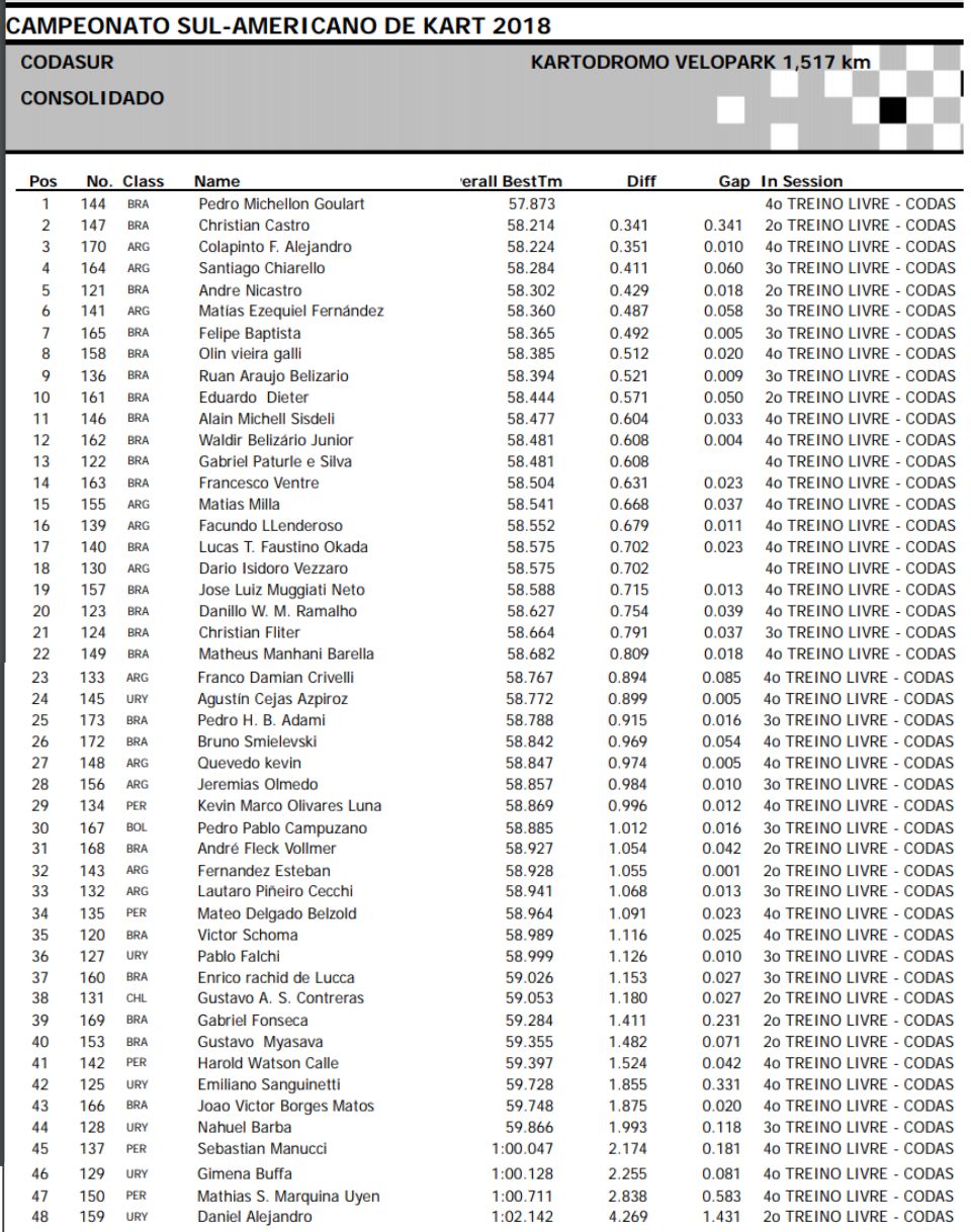 Con Goular escapado casi tres décimas y media. Castro se metió segundo, seguido por dos argentinos: Franco Colapinto (Pilar, Buenos Aires) y Santiago Chiarello (Córdoba), quien el último finde lideró una práctica.