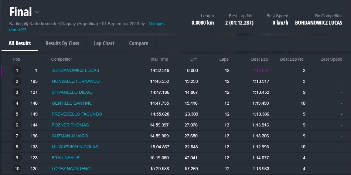 Haciendo una analogia, imparable como la lluvia, fue el piloto de General Pinedo de la provincia del Chaco, Lucas Bohdanowicz, quien se quedo con la pole, las tres mangas y la propia final, aun asi, Lucas tambien paso por situaciones zozobra, al igual que todos, y en la segunda manga hasta llego a perder por unos instantes la primera posicion, producto de la salida de pista mientras llovia intensamente, pero que luego de dos vueltas retomaria la punta de la misma.