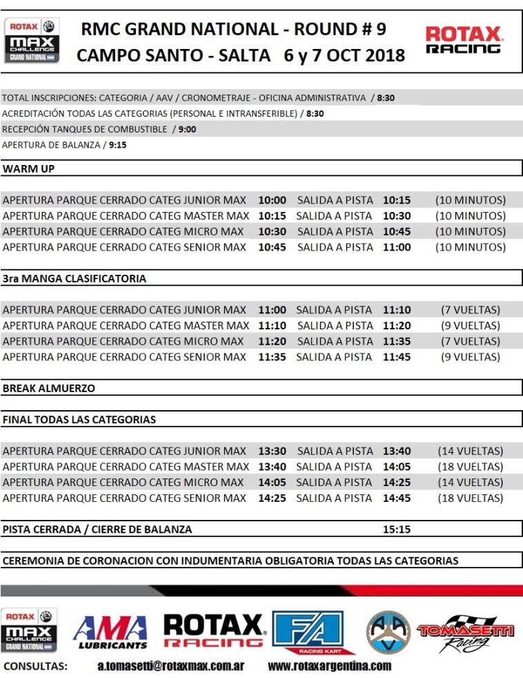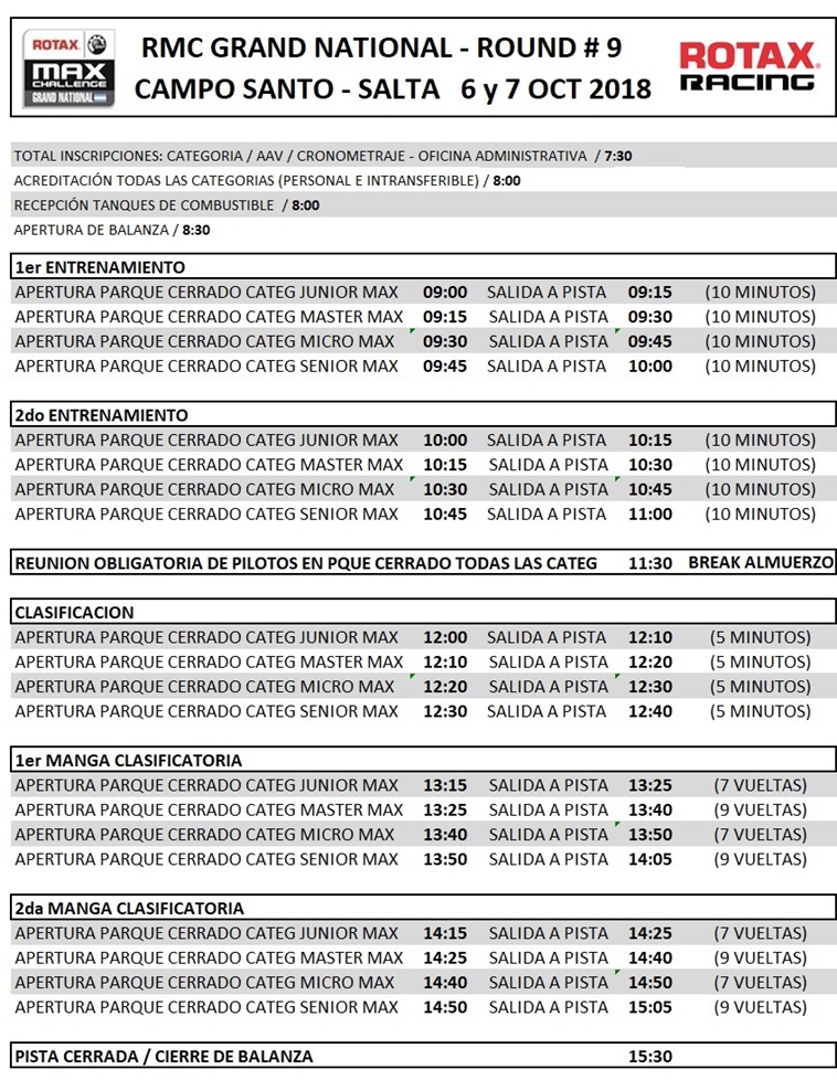 mayor performance de cara a esta novena fecha que dará comienzo mañana , con las pruebas libres a partir de las 9:00 de la mañana, a las 12 la clasificación y posteriormente, a partir de las 13:15, las competencias de todas las divisionales con las dos mangas clasificatorias. Mientras que el dia Domingo, darán comienzo con las actividades a partir de las 10 de la mañana con los Warm up, la tercera manga clasificatoria a las 11 y el plato fuerte de la jornada serán las finales de todas las categorías a partir de las 13:30.