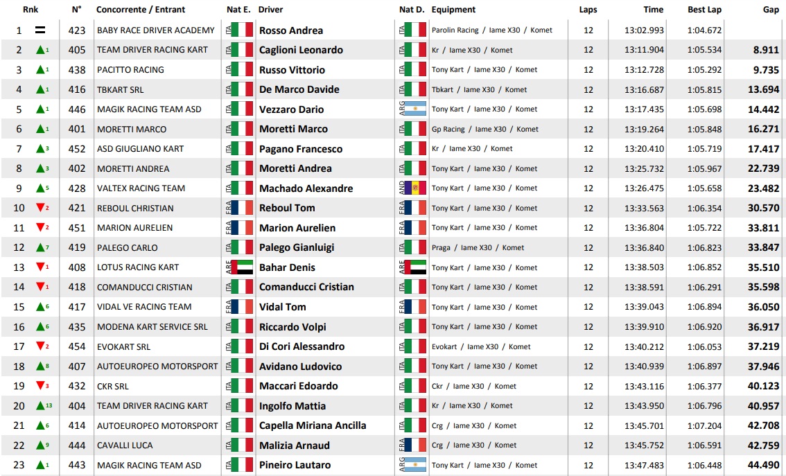 Las cuatro categorías en la carrera, con un número limitado, tienen el mayor número de miembros en el 60 Mini con 72 pilotos, seguidos del KZ2 con 61 pilotos, el Iame X30 Senior con 54 pilotos, el OK-Junior con 53 pilotos. El mayor número de conductores extranjeros se concentra en el 60 Mini con 43 conductores extranjeros y 29 italianos, y también en el OK-Junior, con 43 conductores extranjeros y 10 italianos. En KZ2 entre los 61 miembros, 36 son italianos, 25 son extranjeros. En el X30 Senior, 40 pilotos italianos y 14 extranjeros.