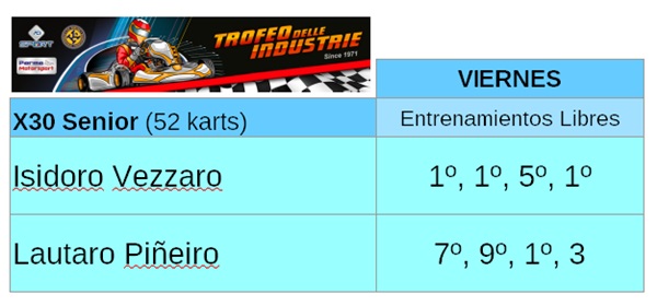 En el Iame X30 Senior, el más veloz fue el argentino Isidoro Vezzaro en Tony Kart en 48.736, Danny Carenini en CRG en 48.861, el otro argentino Lautaro Pineiro en Tony Kart en 48.872, Luca Bosco en Tony Kart en 48.916 y Leonardo Caglioni en KR en 48.957.