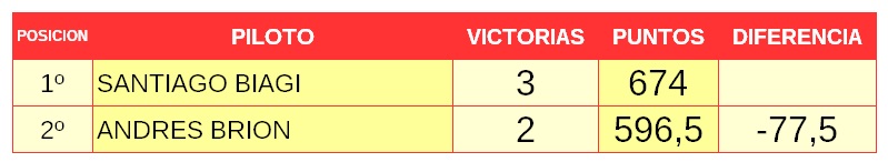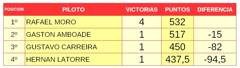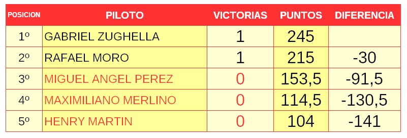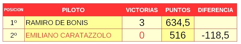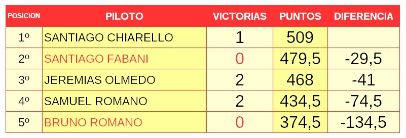 En los números, manda el neuquino Bautista Lohrmann quien consiguió la victoria en la última fecha. El tucumano Lorenzo Daz lo persigue a solo 6,5 puntos y a 12,5 está el bonaerense Juan Ignacio Alessi, Luego siguen el brasilero Enzo Falquete y el correntino Benjamín Traverso. Distintas provincias y hasta países, pero todos con igual objetivo: ser campeón y conseguir el cupo al mundial.