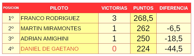 Con 153 unidades en juego, el juego se abre a estos 9 pilotos, pero ojo porque Falquete, Keheyan y Bodrato Mionetto todavía no han ganado. Se romperá la racha de ganadores distintos?