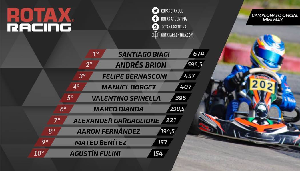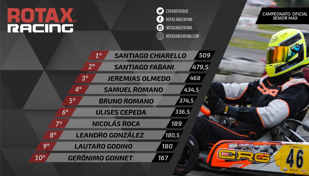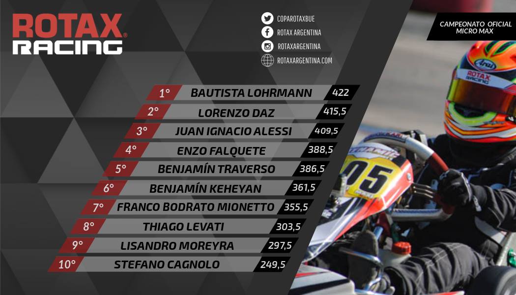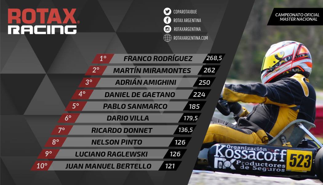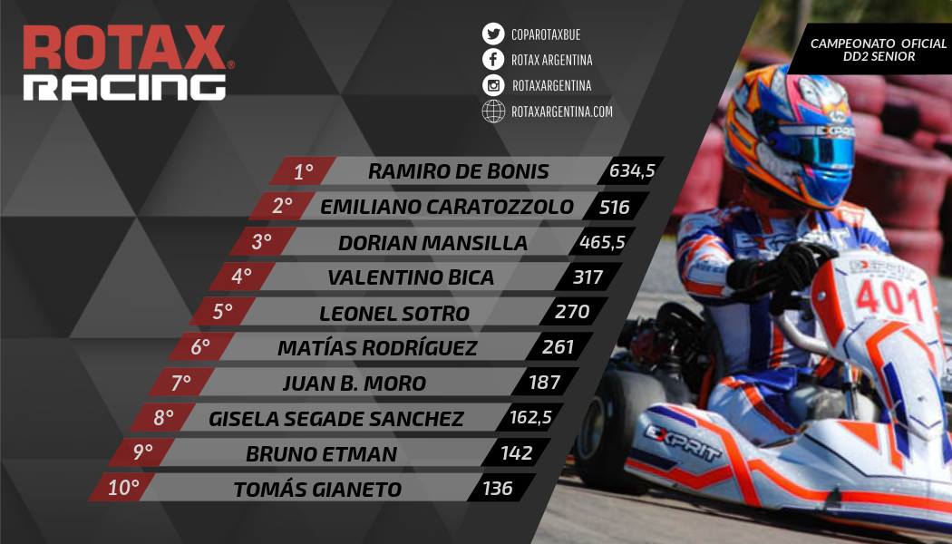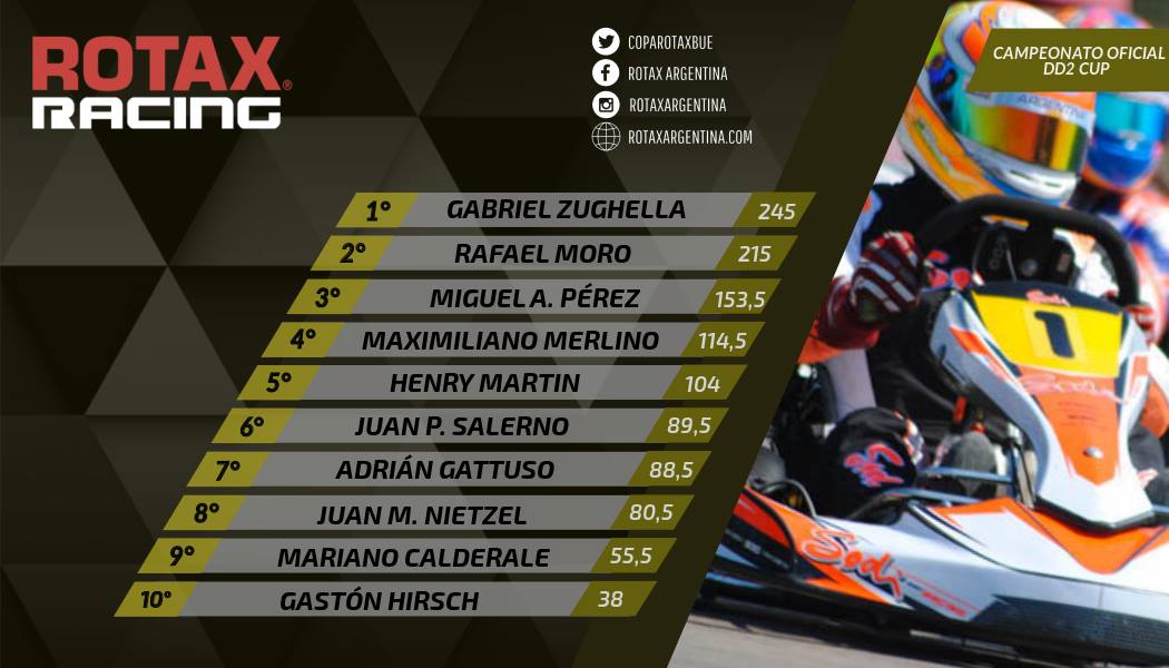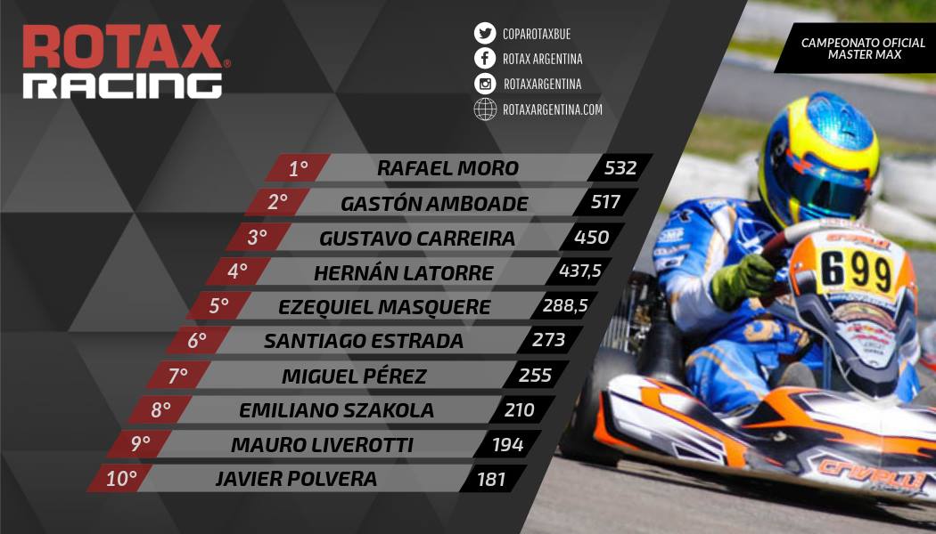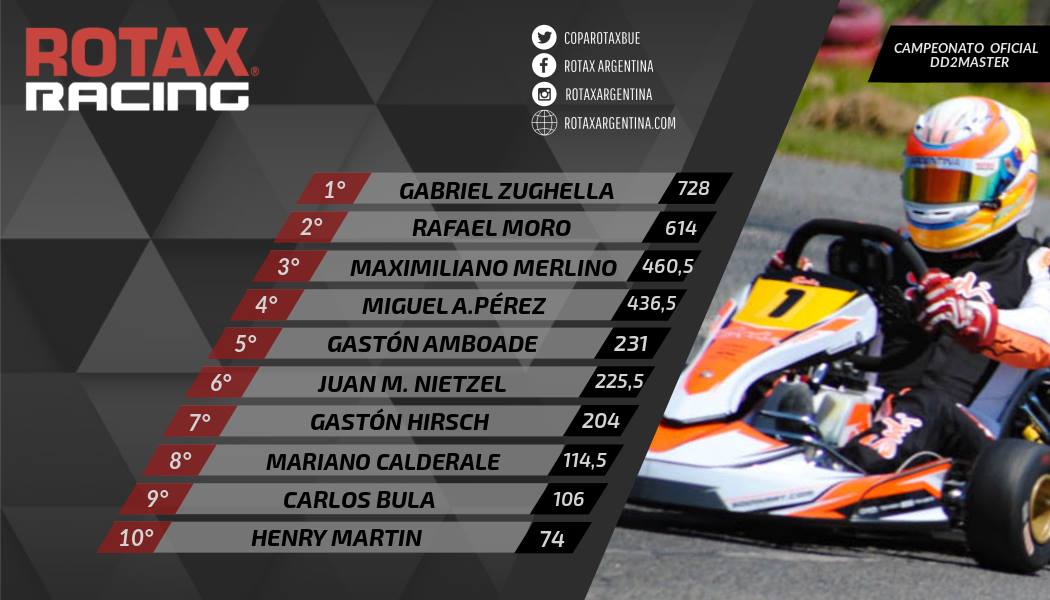 Vale aclarar que Rotax emitió un comunicado con el orden de jerarquías (ver aquí) ya que hay dos kartistas que pelean en diferentes frentes: Moro (Master Max, DD2 Máster y DD2 Cup) y Zughella (DD2 Máster y DD2 Cup).