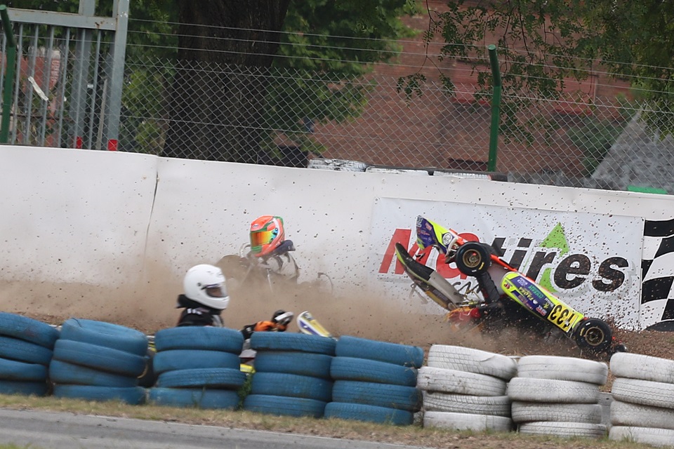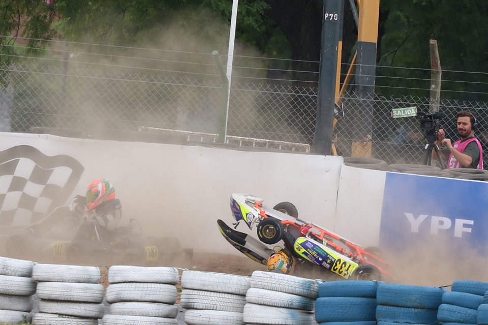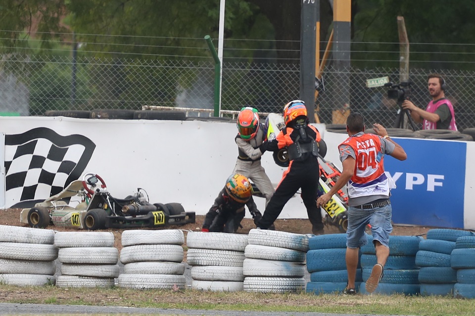 Thiago sufrió un fuerte vuelco antes de llegar a la curva uno y quedó debajo de su kart. Sus compañeros Genaro Castillo (Chubut) y Maxi Bustos (Córdoba) fueron los primeros en auxiliarlo y quitarle de encima el kart, en un acto para destacar respecto de ambos pilotos.