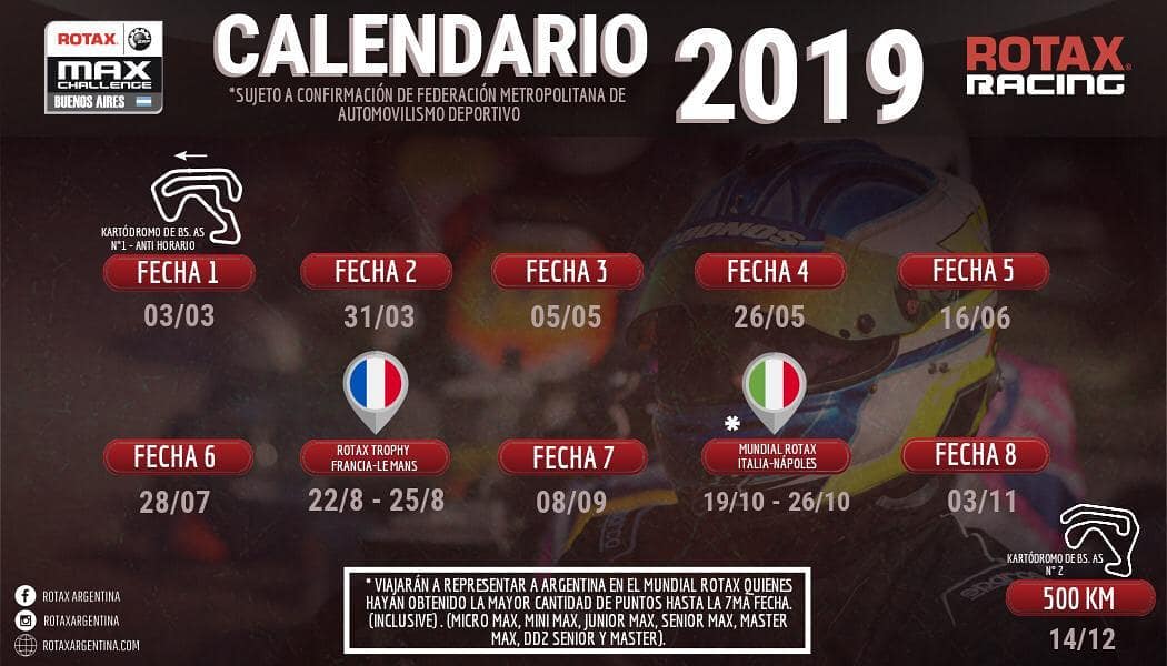 Rotax Buenos Aires dio a conocer hoy el Calendario 2019 “tentativo” que estará compuesto por 8 eventos e inicia la primera semana de marzo en el kartódromo del Gálvez.