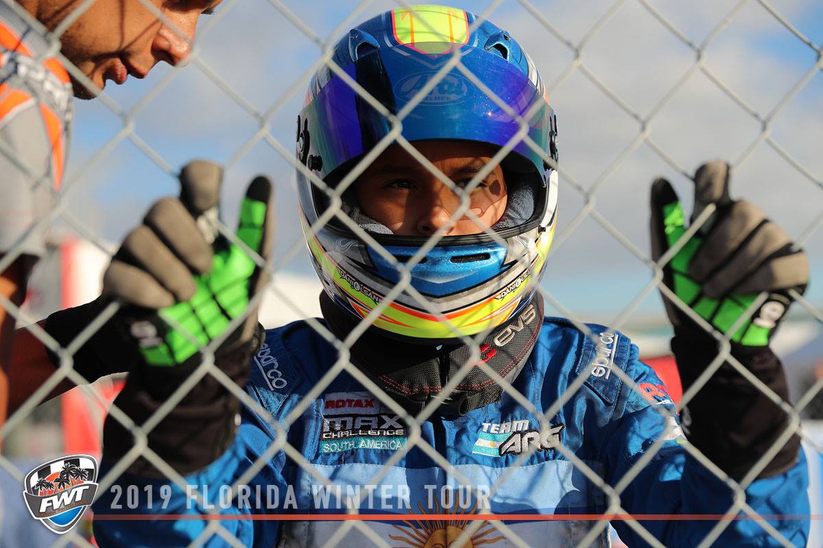 Alessandro De Tullio tiene su padre argentino y siempre luce la albiceleste en su kart. “Aless” había sido 5º y 6º en las prácticas, pero finalmente clasificó 23º y le tocará remarla en los heats. Así lo hizo en el único del sábado, donde avanzó y quedó 19º, a pesar de haber recibido una penalización. Es parte del equipo AM Racing Kart de Ariel Castro.