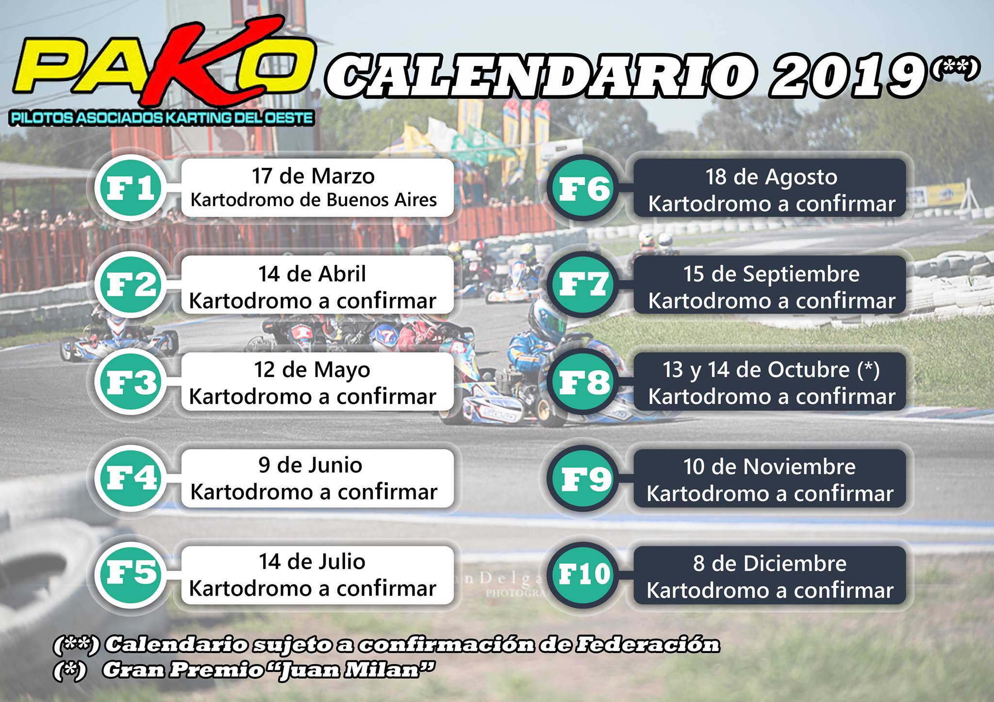 El campeonato PAKO dio a conocer su calendario tentativo 2019, que como los demás publicados en Buenos Aires, se encuentra sujeto a la aprobación de la Federación Metropolitana de Automovilismo.