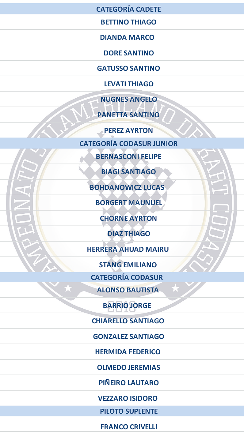 Hace minutos, la Comisión Nacional de Karting dio a conocer el listado de 24 pilotos seleccionados para el Campeonato Sudamericano Codasur de Karting 2019 (motores IAME), que se llevará a cabo del 29 de mayo hasta el 1 de junio de 2019 en el Kartódromo Velopark (región de Porto Alegre, Brasil).
