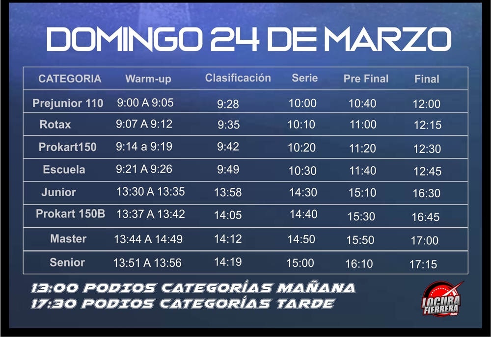 Otra de las novedades será el cronograma del día domingo, dónde las categorías más chicas y la prokart 150 estarán corriendo por la mañana y las otras categorías más grandes se desarrollarán por la tarde.