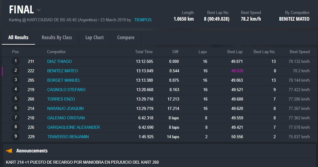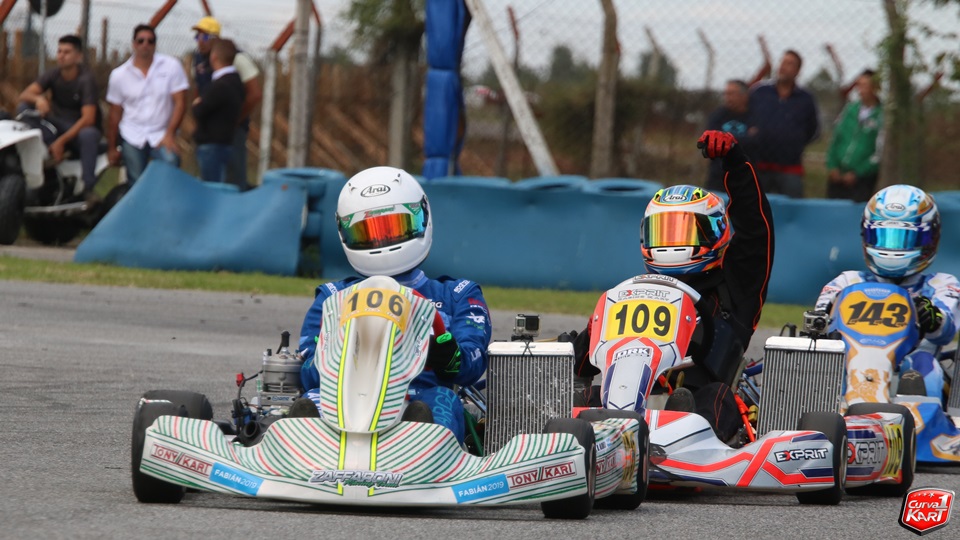En la primera vuelta hubo un toque múltiple donde el sanjuanino Joaquín Naranjo que venía segundo, se enredó con Gargaglione y momentos después con Cristian Galeano, que intentó esquivar el incidente y fue el más perjudicado al dañarse su kart y abandonar la carrera.