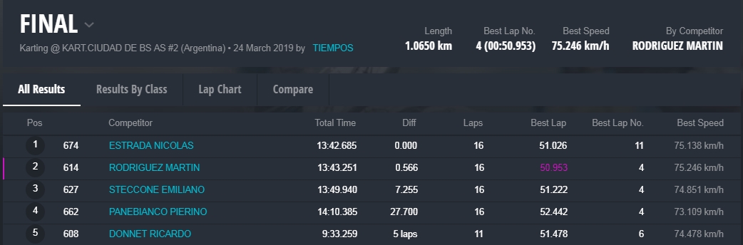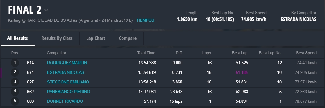 Faltando cuatro vueltas no existían diferencias y Estrada intentó algunos sobrepasos, hasta que en una maniobra hubo un toque que desestabilizó a Martín. Nicolás, en una actitud deportiva ejemplar, le devolvió el lugar, le hizo una seña para que pasara y fue de vuelta a buscar la punta. Rodríguez ahora se defendió muy bien y pudo cantar victoria recién en los últimos metros.