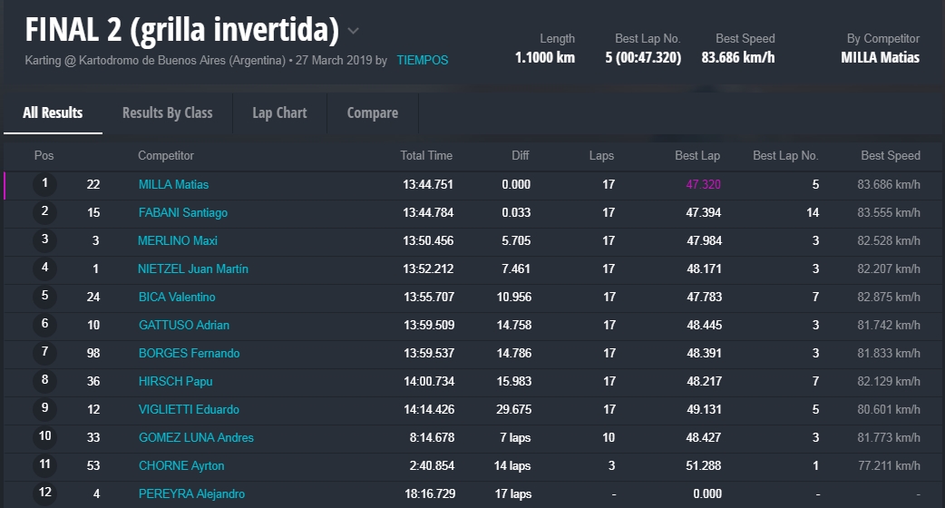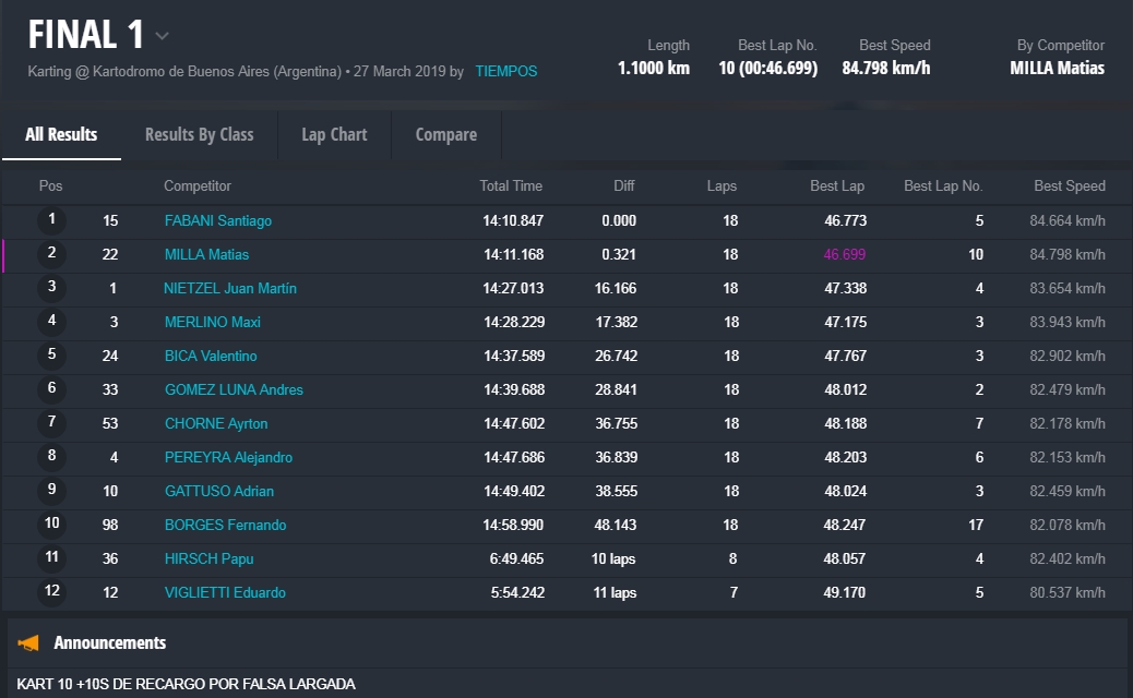 El destacado de la noche fue Matías Milla, recientemente anunciado como piloto oficial Renault en Súper TC2000. El volante de Campana se llevó al pole position y luego la Final 2. En la previa, el joven Santiago Fabani había sido el vencedor de una Final 1 muy reñida.