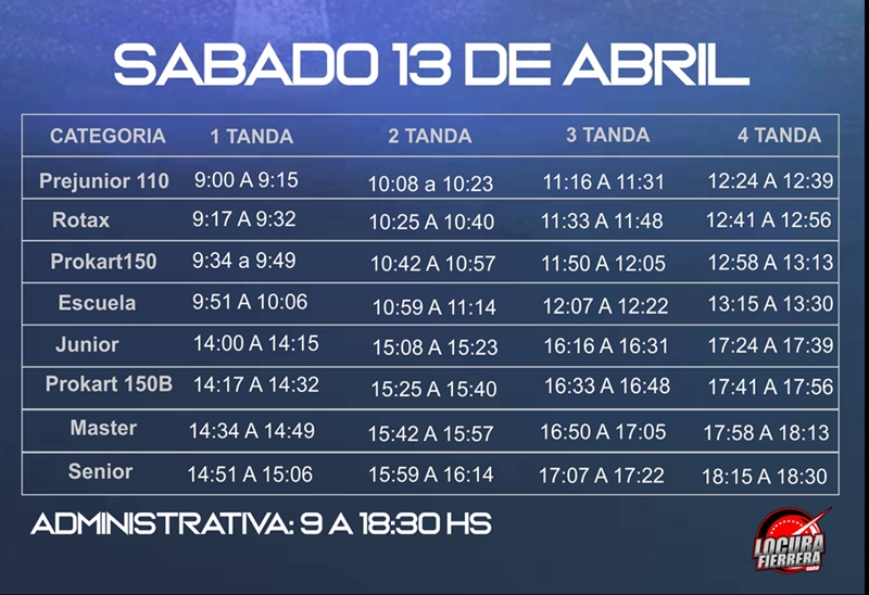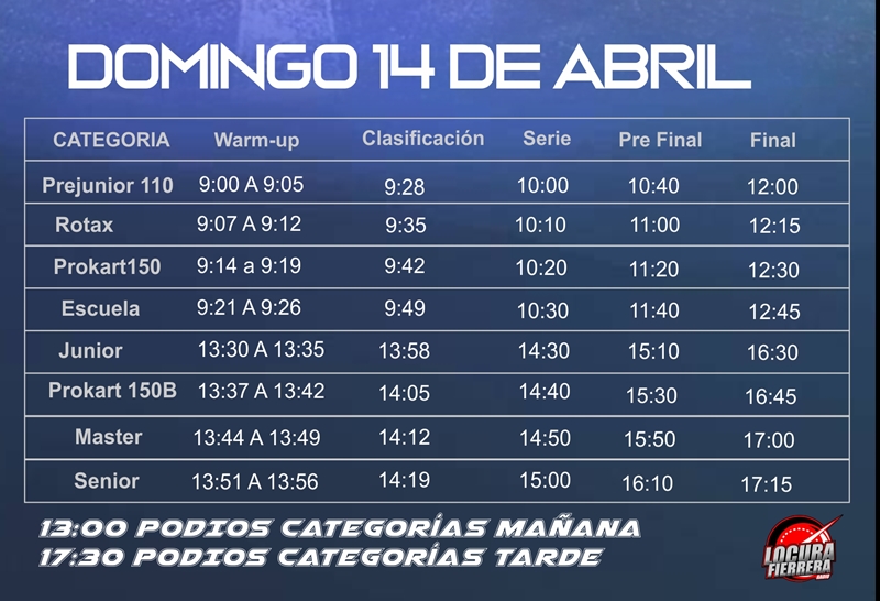 La actividad de la fecha #2 arranca el día sábado con las pruebas no oficiales y el domingo se desarrollará toda la actividad oficial. A la mañana correrán las categorías Prejunior 110, Rotax, Prokart 150 y escuela. Por la tarde Junior, Prokart 150B, Master y Senior.