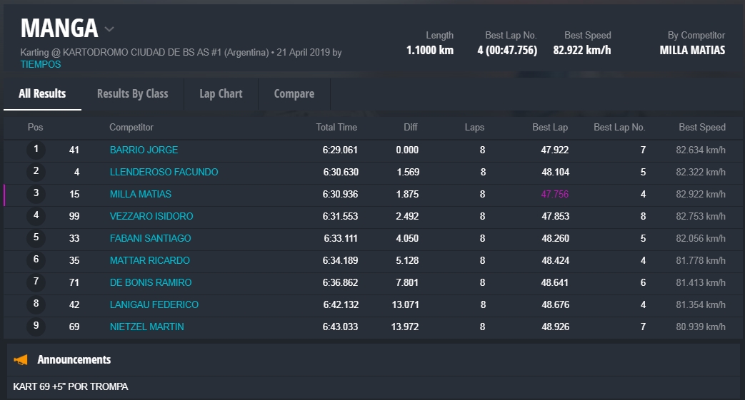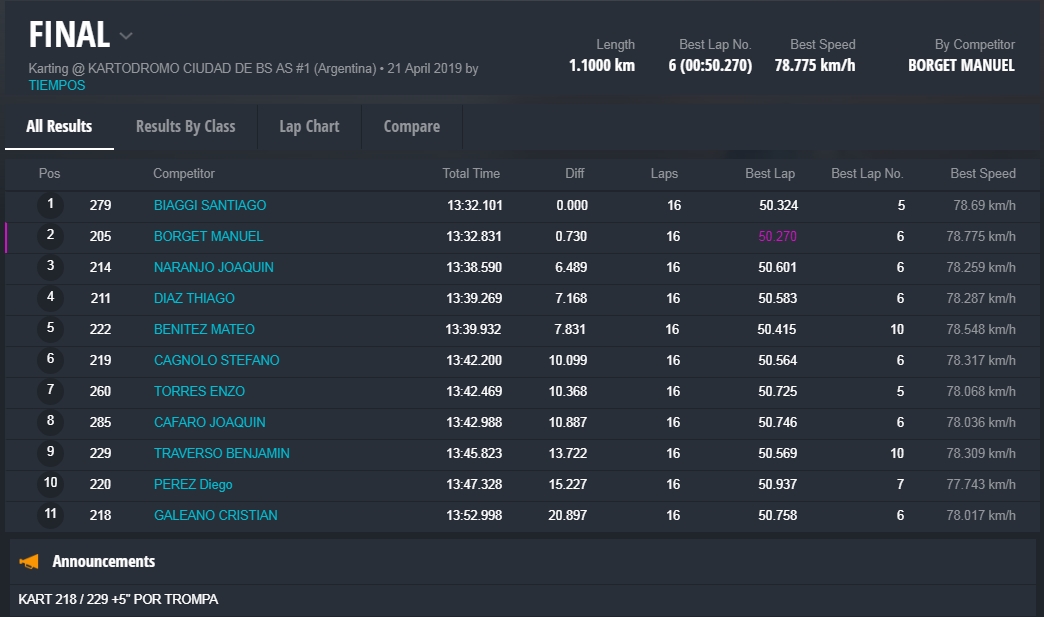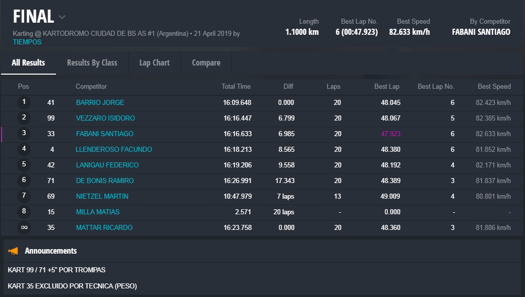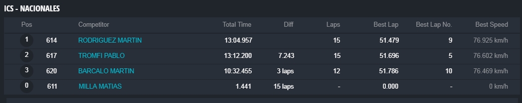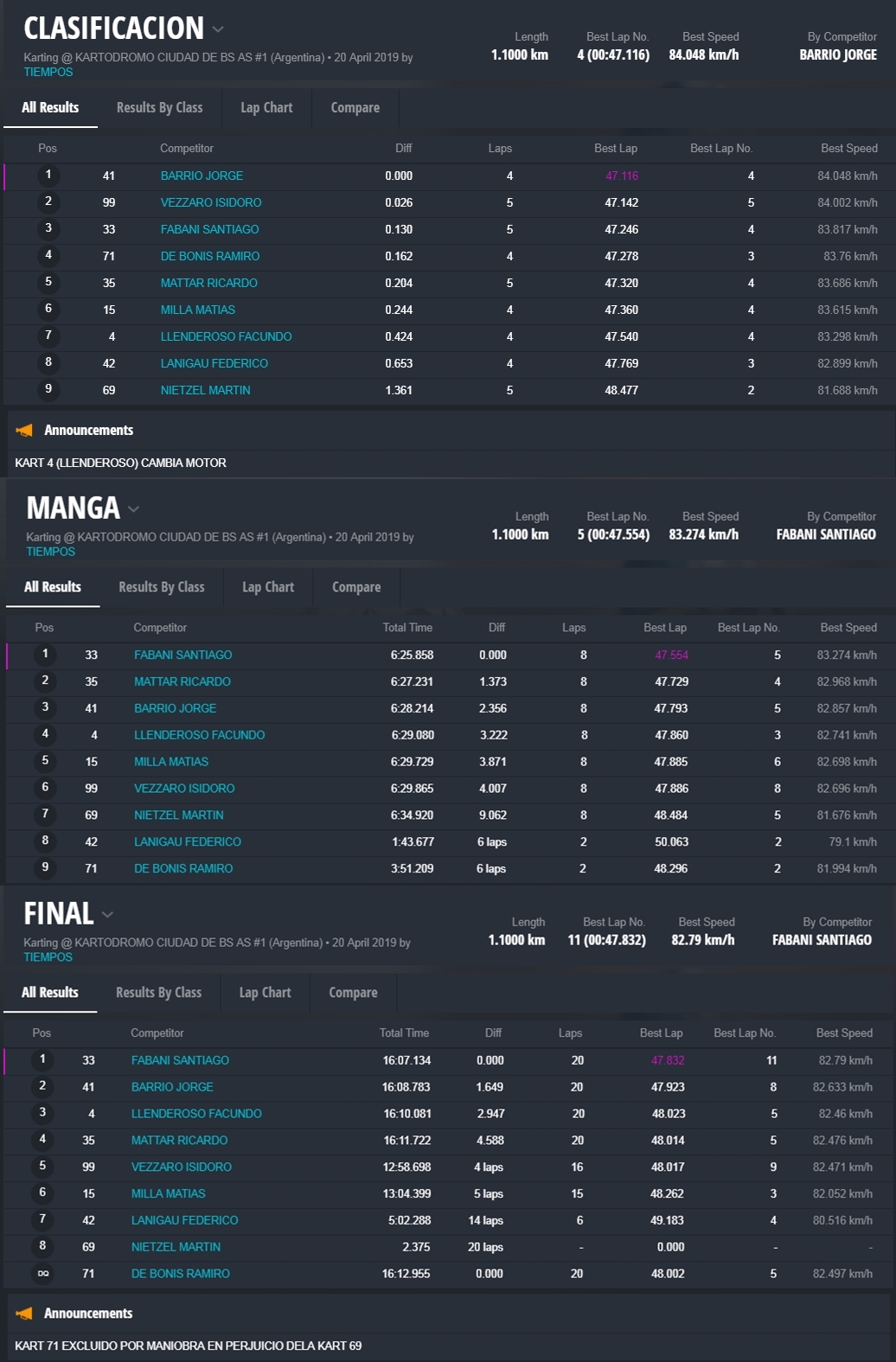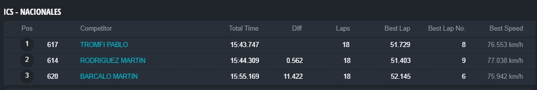 Barrió partió adelante y fue el primer en ver la bandera a cuadros, dejando atrás al cordobés Isidoro Vezzaro y a Santiago Fabani, quien quedó último en las primeras vueltas, pero se recuperó y, con récord de vuelta, llegó hasta el tercer lugar.