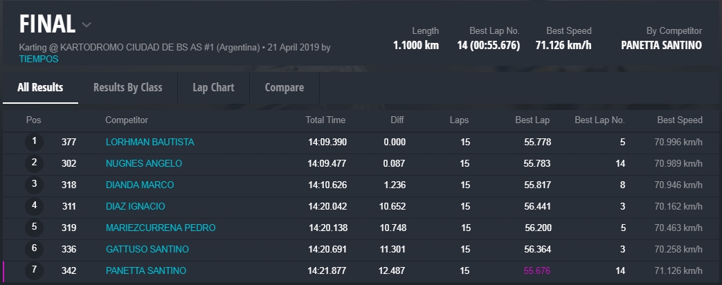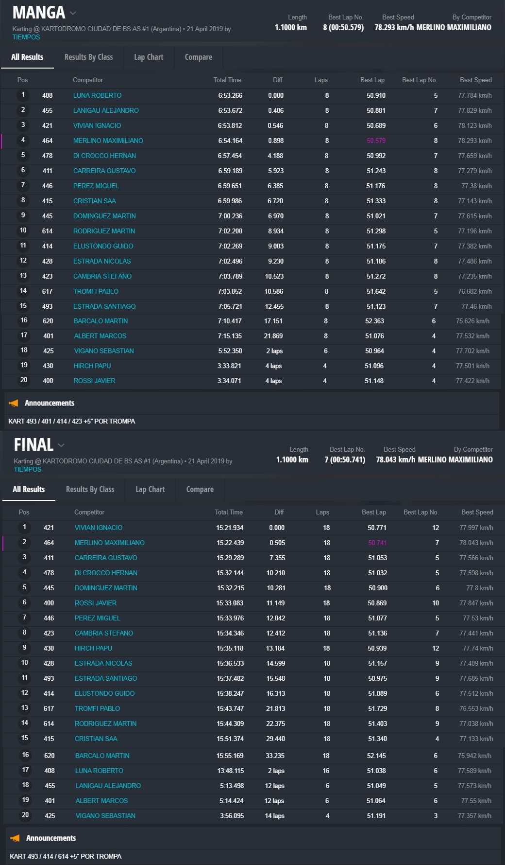 Merlino fue escolta luego de un gran trabajo. Completó el podio Gustavo Carreira, piloto del equipo Zaffaroni Kart que subió a la premiación por segunda vez en el fin de semana. Luego llegaron Hernán Di Crocco, Martín Domínguez y Santiago Estrada, estos dos últimos, escalando varias posiciones.