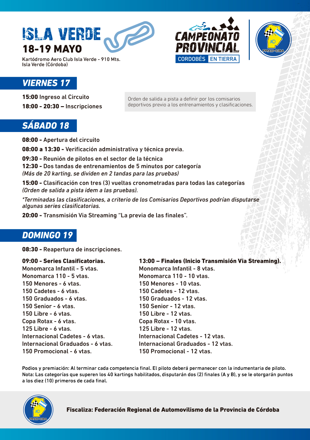 La segunda competencia de la temporada 2019 del Campeonato Provincial Cordobés de Karting en Tierra, a disputarse en el Kartódromo del “Aero Club Isla Verde”, se encuentra confirmada.