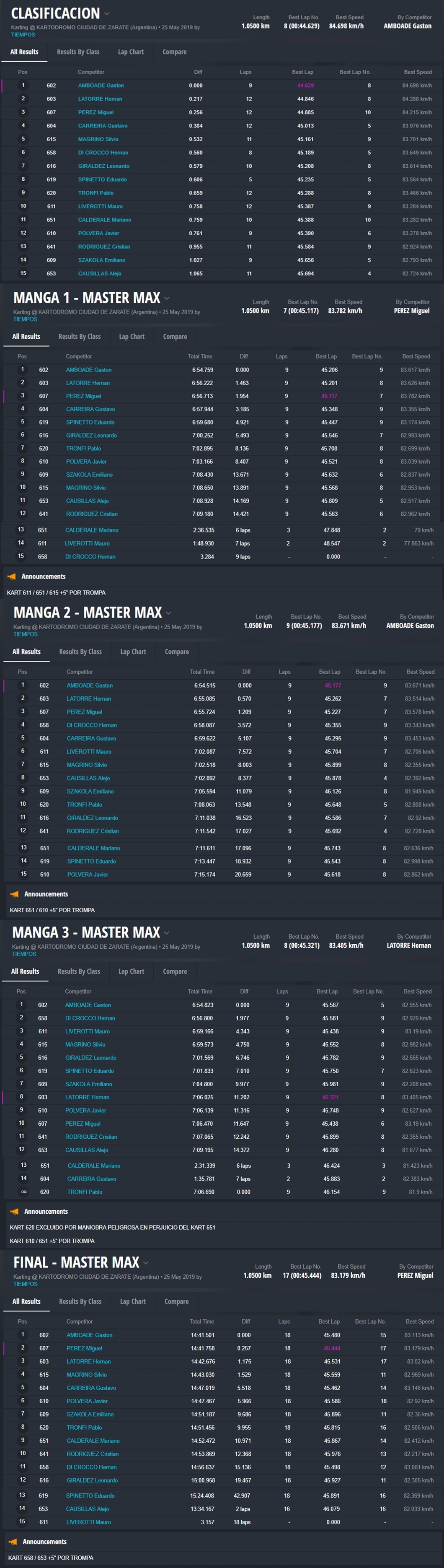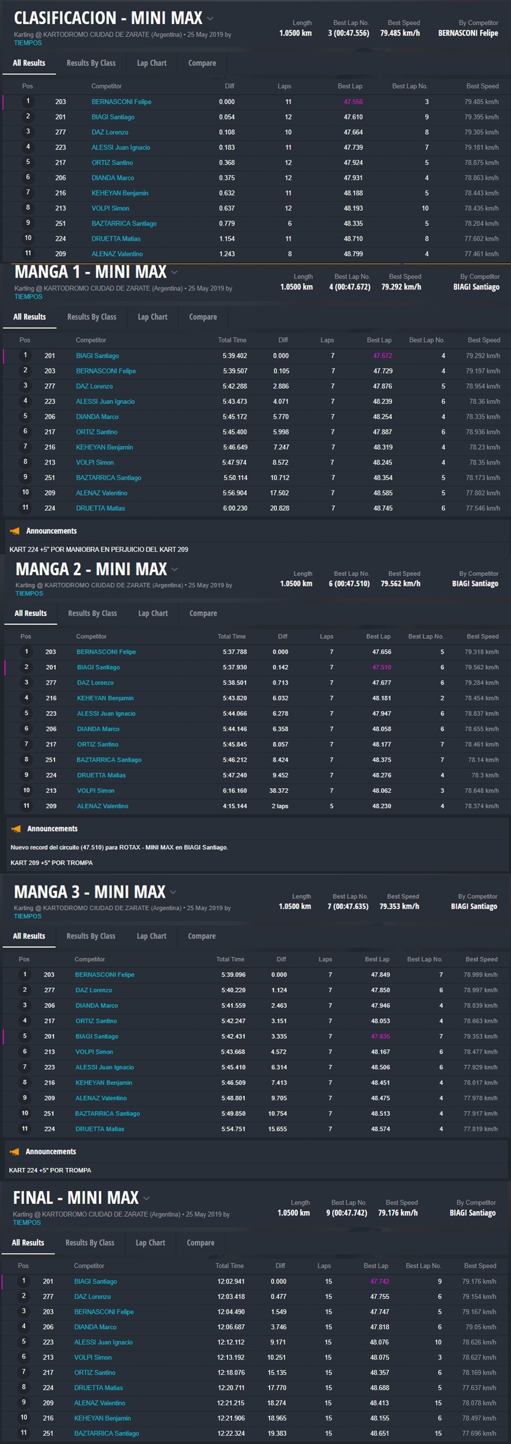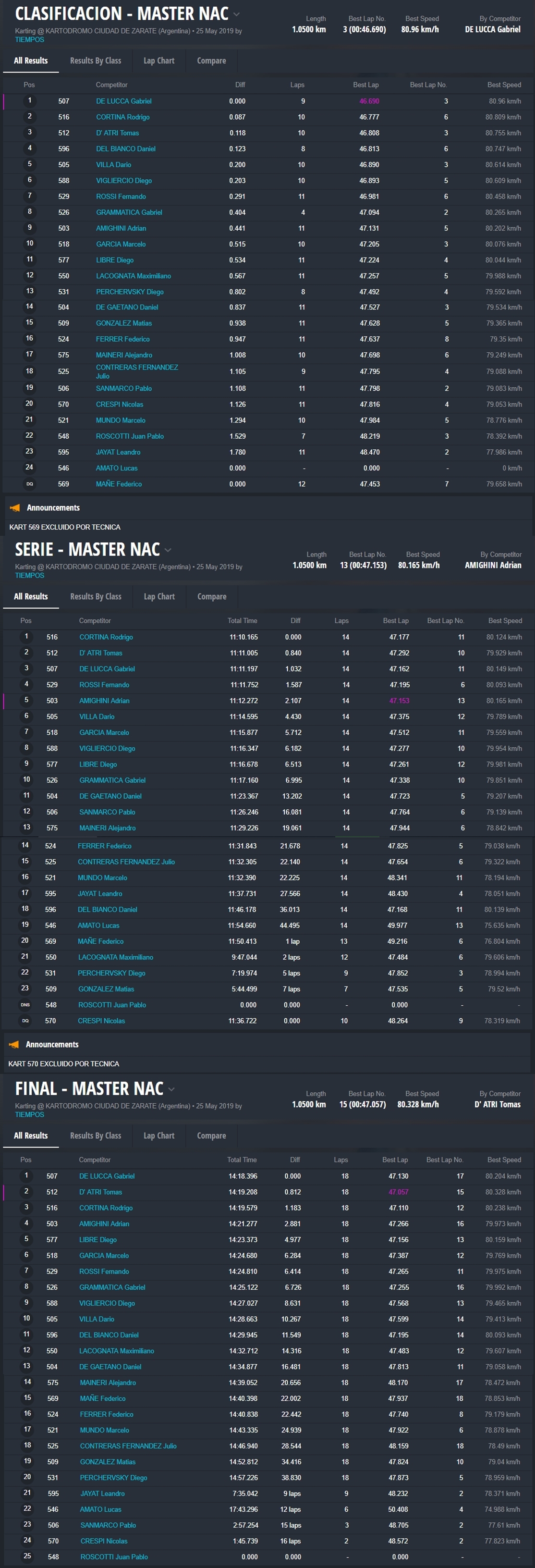 Fue para destacar la gran carrera final que brindaron los pilotos de la categoría Junior Max, con cambios constantes entre los puestos del podio. También la lucha por la punta de Senior Max que tuvieron Santiago Fabani y Francesco Grimaldi, como también el aplastante fin de semana de Gastón Amboade en Máster Max, donde logró puntaje perfecto.