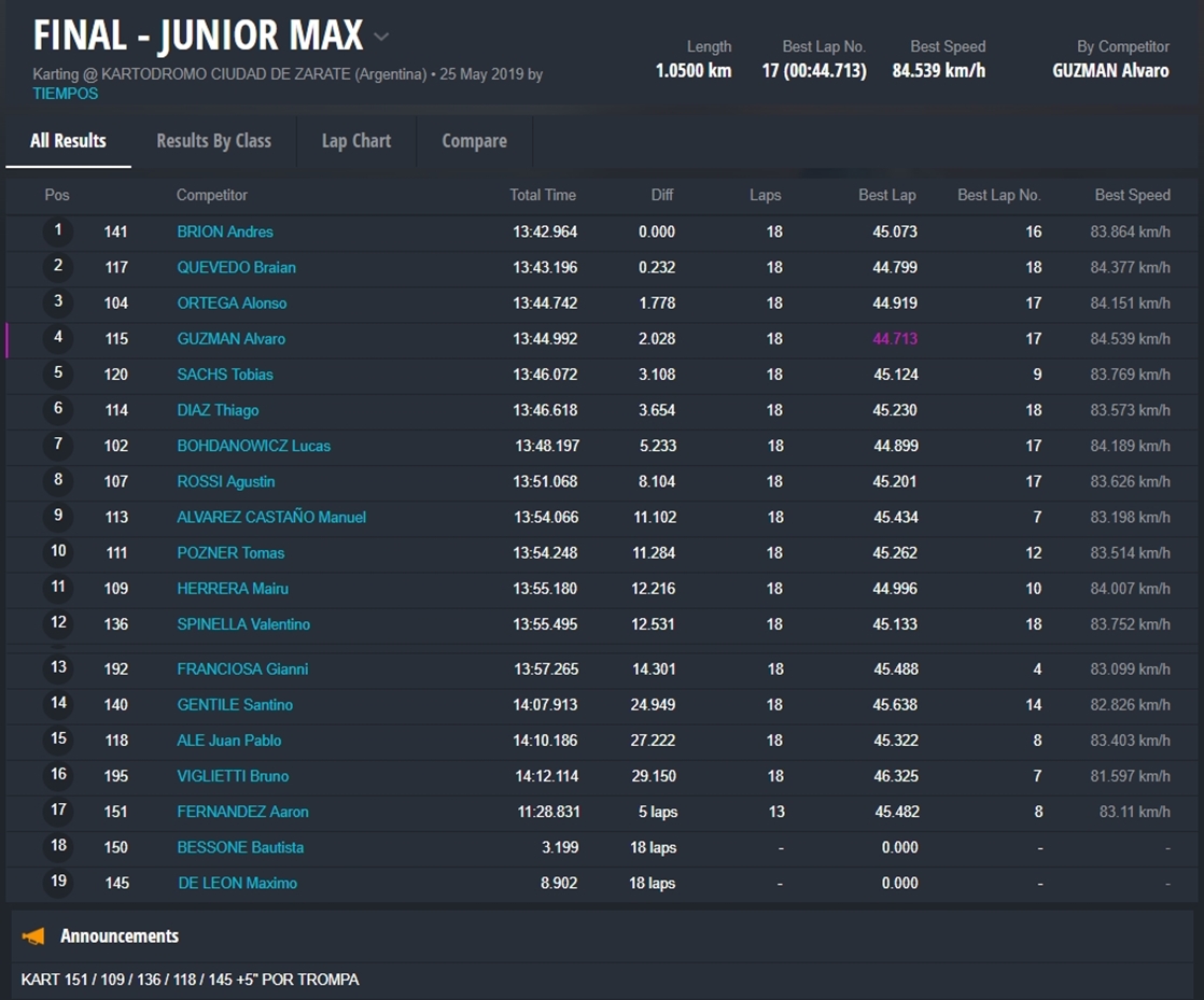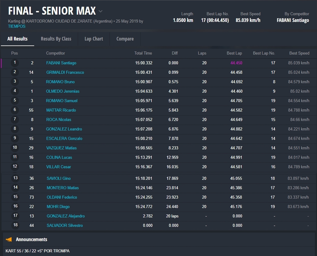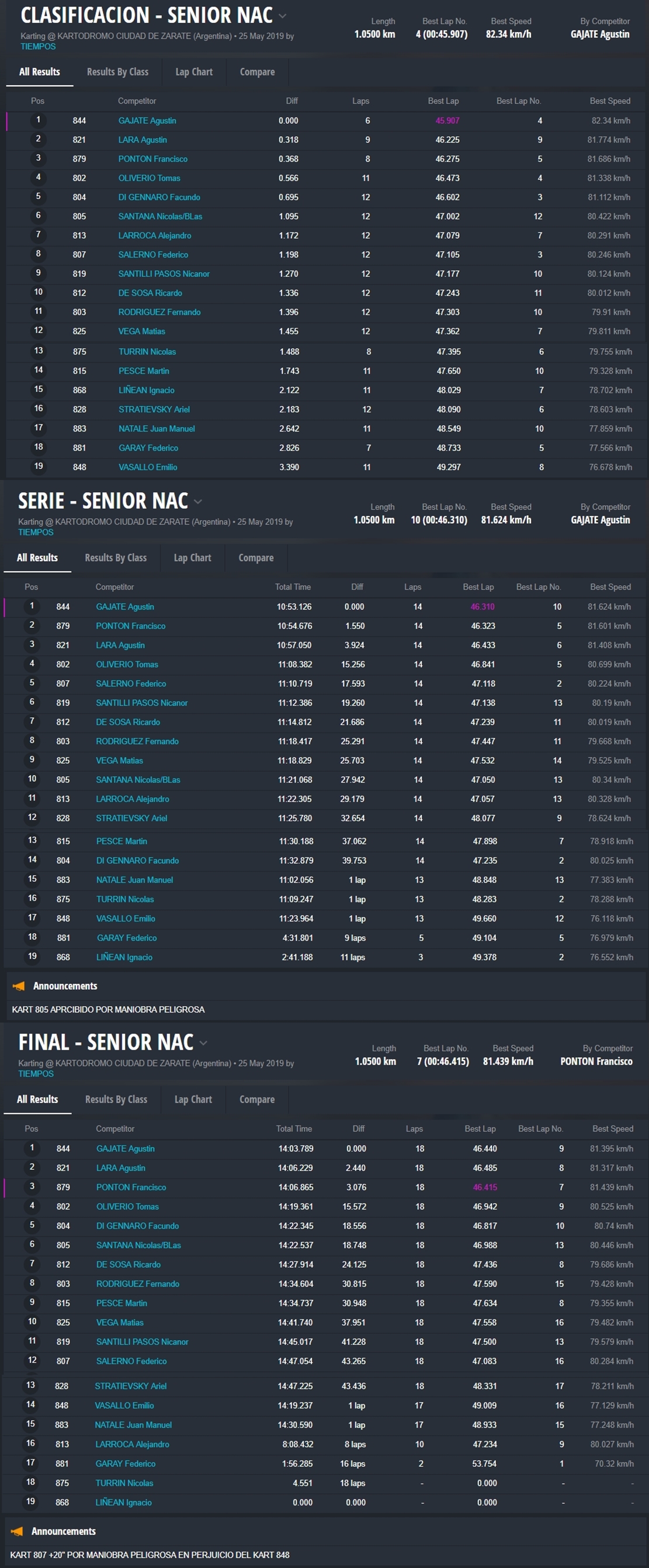 Fue para destacar la gran carrera final que brindaron los pilotos de la categoría Junior Max, con cambios constantes entre los puestos del podio. También la lucha por la punta de Senior Max que tuvieron Santiago Fabani y Francesco Grimaldi, como también el aplastante fin de semana de Gastón Amboade en Máster Max, donde logró puntaje perfecto.