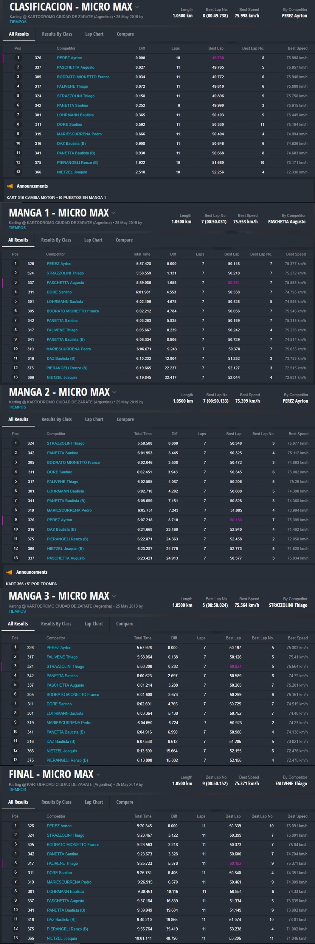 Ayrton Pérez logró su segundo triunfo del año en Micro Max y volvió a ser competitivo. En Mini Max, Santiago Biagi volvió a ganar y estirá diferencias en el campeonato, mientras que en Junior se vivió un “carrerón” donde ganó Andrés Brión.