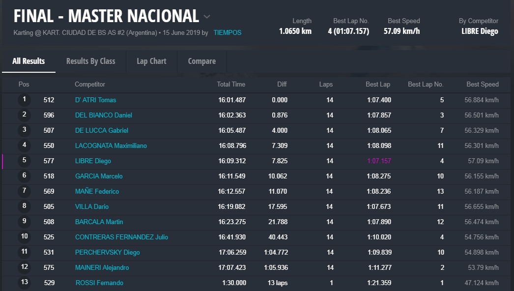Tomás D´Atri largó cuarto y en pocas vueltas se metió en los puestos del podio. Mientras Del Bianco dominaba, D´Atri comenzó su ataque. Lo buscó y pegó el zarpazo en el momento justo. Del Bianco se equivocó mínimamente enfrente de la confitería, su kart su movió, y Tomás aprovechó un par de curvas más adelante para superarlo y encaminarse a la victoria.