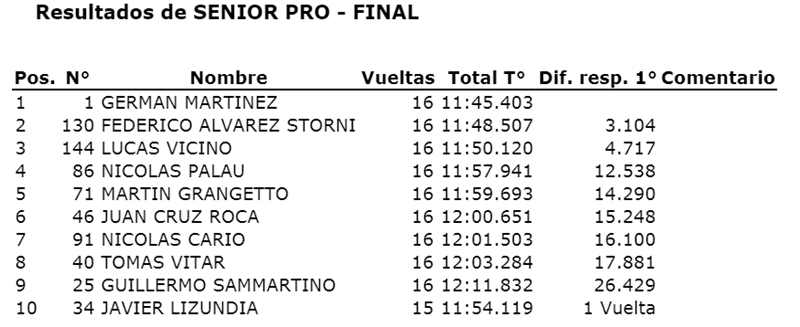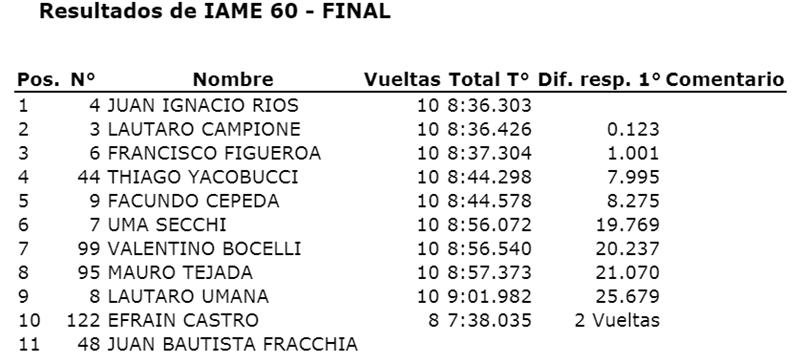 Juan Ignacio Ríos volvió a ganar, esta vez luego de una muy buena presentación. El piloto de Godoy Cruz largó segundo y se mantuvo como escolta del lasherino Lautaro Campione durante un buen tiempo, hasta que saltó adelante y consiguió de esta forma su segundo trofeo de la temporada.